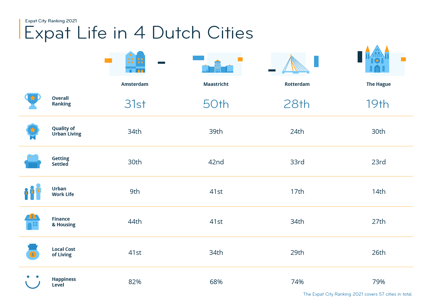 The Hague comes 19th out of 57 cities in the Expat City Ranking 2021, the highest rank among the Dutch cities included in this report. The city places 14th in the Urban Work Life Index, narrowly missing out on the top 10 in both the Job & Career (12th) and the Job Security (11th) Subcategories. Expats are happy with the local career opportunities (55% vs. 45% globally), the state of the local economy (84% vs. 62% globally), and their work-life balance (75% vs. 66% globally). “I like the balance between work and your private life, as well as the flexibility of working hours,” says a female expat from Italy.