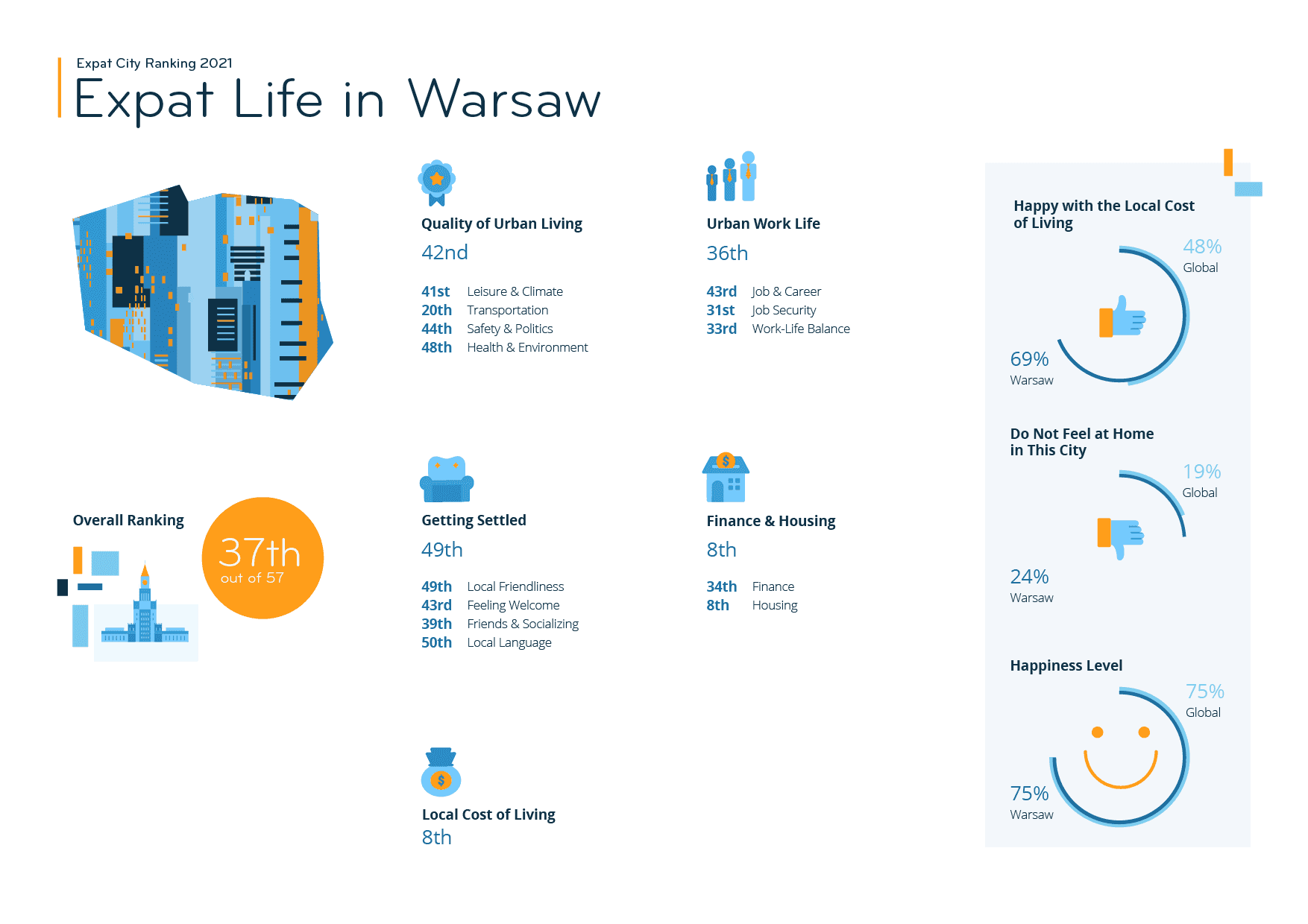 Ranking 37th out of 57 in the Expat City Ranking 2021, Warsaw makes it into both the top and the bottom 10 worldwide in different indices. The city performs worst in the Getting Settled Index (49th), with particularly poor results for Local Friendliness (49th) and Local Language (50th): three in four expats (75%) have difficulties learning the local language (vs. 42% globally), and 36% describe the people in Warsaw as generally unfriendly towards foreign residents (vs. 18% globally). “People seem cold, and it is difficult to socialize and make friends,” shares a Portuguese expat. Maybe this why only 46% of expats feel at home in Warsaw (vs. 65% globally).