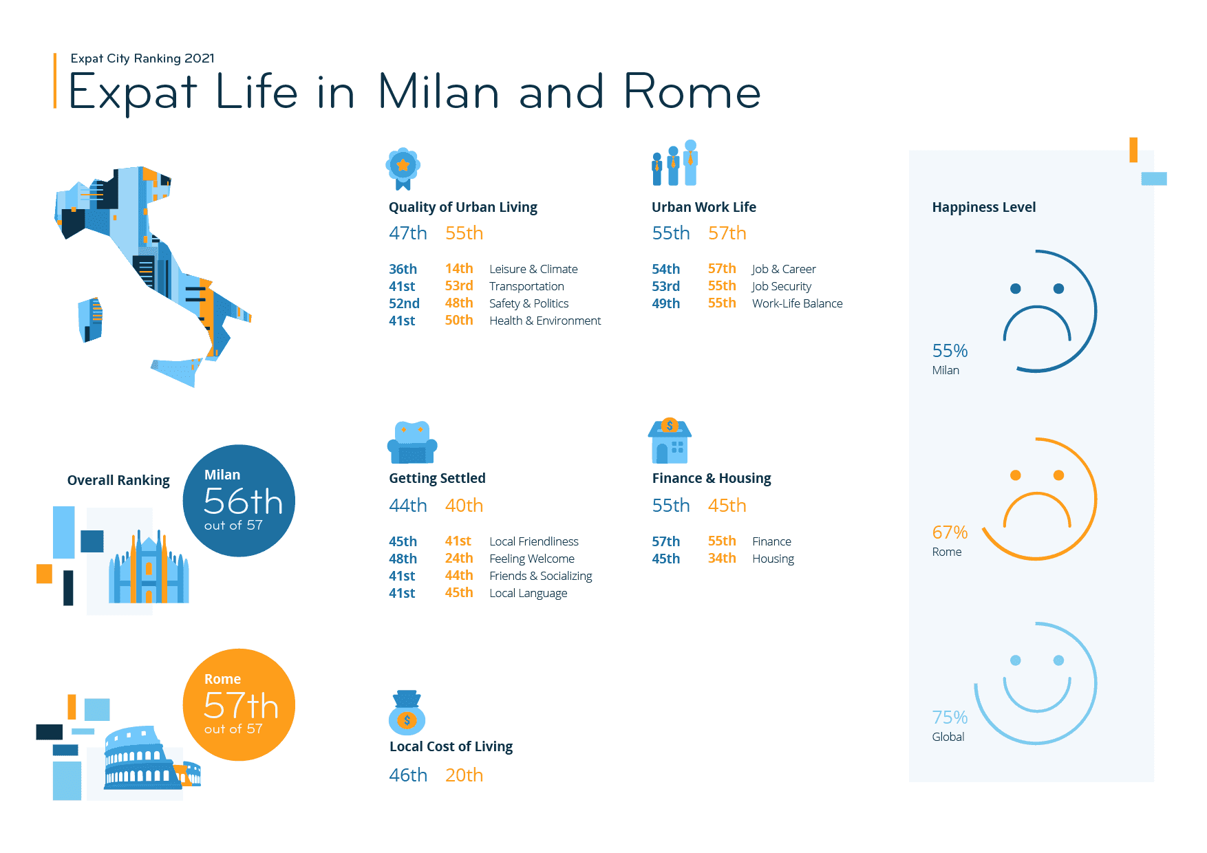 Rome is rated the worst city (57th out of 57) in the overall Expat City Ranking 2021, as well as in the Urban Work Life Index (57th). It also lands among the bottom3 in all of this index’s subcategories: Job & Career (57th), Job Security (55th), and Work-Life Balance (55th). A male expat from the UK sums it up: “The economy is terrible, and salaries are low.” Expats are unhappy with the career opportunities (60% vs. 33% globally), job security (45% vs. 20% globally), and working hours (27% vs. 16% globally).