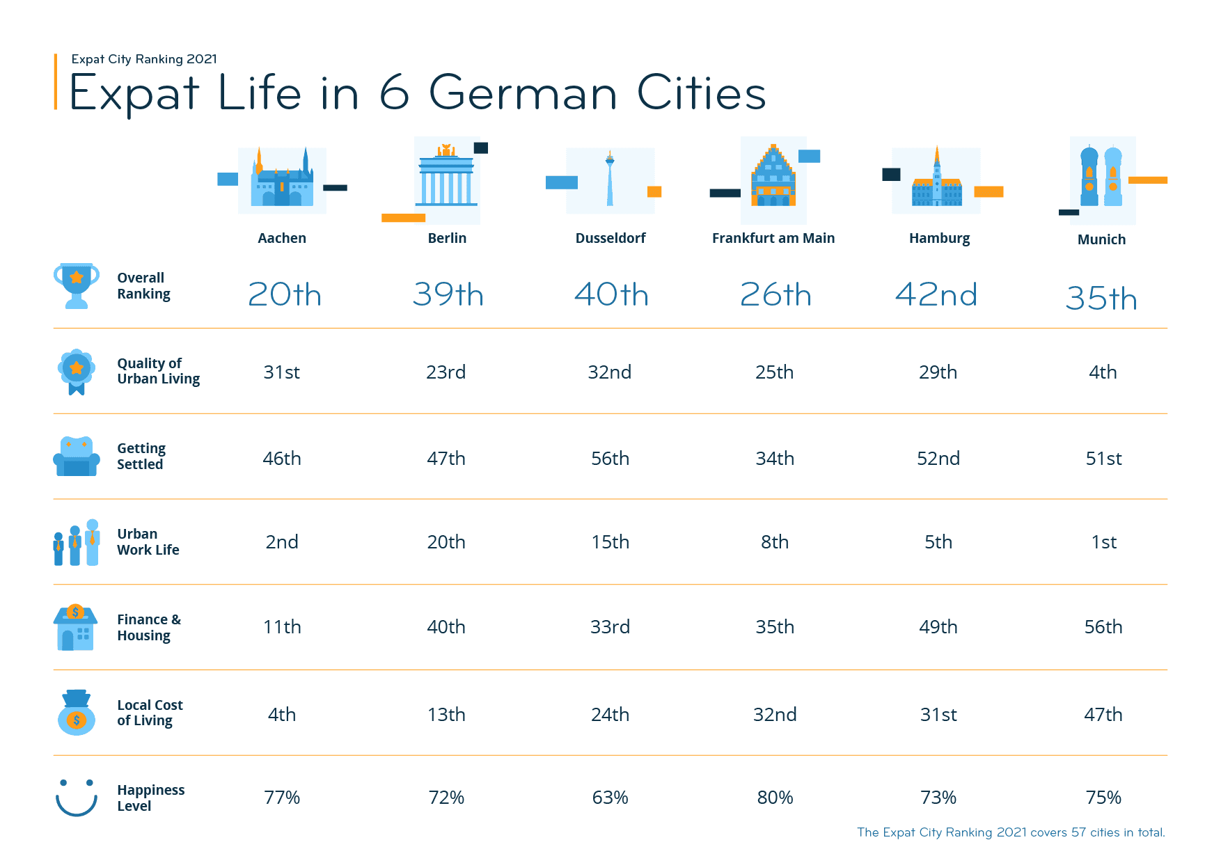 Ranking 35th out of 57 in the Expat City Ranking 2021, Munich makes it into both the top and the bottom 10 in different indices.