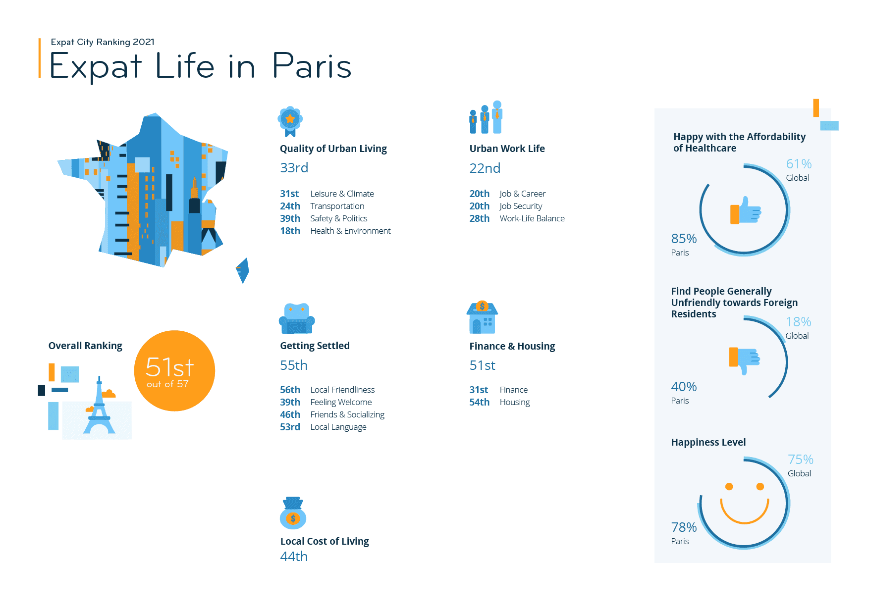 While Paris lands in an average 33rd place in the Quality of Urban Living Index, two factors affect its performance: one in five expats (20%) does not feel safe in Paris (vs. 8% globally), ranking it just ahead of Mexico City (55th), Cape Town (56th), and Johannesburg (57th). Additionally, Paris comes 49th for its urban environment, with 23% of expats rating this factor negatively (vs. 16% globally). On the other hand, the city makes it into the top 10 for two factors. It ranks 2nd for affordable healthcare (85% happy vs. 61% globally) and 8th for the local leisure options (86% happy vs. 72% globally).