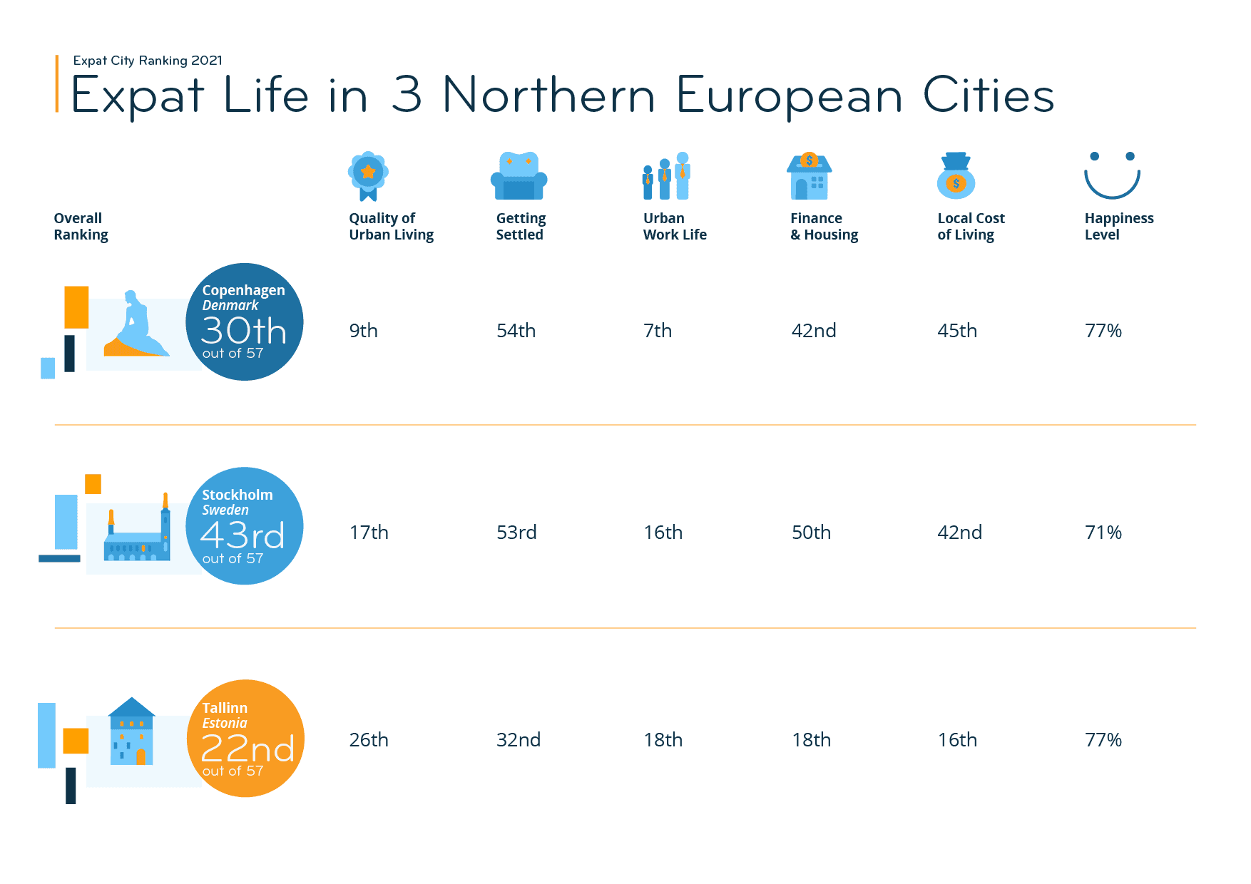 Tallinn performs a lot better in the Finance & Housing Index (18th). Expats describe housing as affordable (50% vs. 42% globally) and quite easy to find (60% vs. 60% globally). “My partner and I were even able to purchase a flat here, which was a rather easy process,” a Lithuanian expat explains. Lastly, Tallinn ranks above the global average in the Local Cost of Living (16th) and Urban Work Life (18th) Indices. The city even makes it into the top 5 for working hours (4th): 73% of survey respondents are satisfied with this factor (vs. 66% globally). They are also happy with the job security (72% vs. 61% globally) and local career opportunities (55% vs. 45% globally).