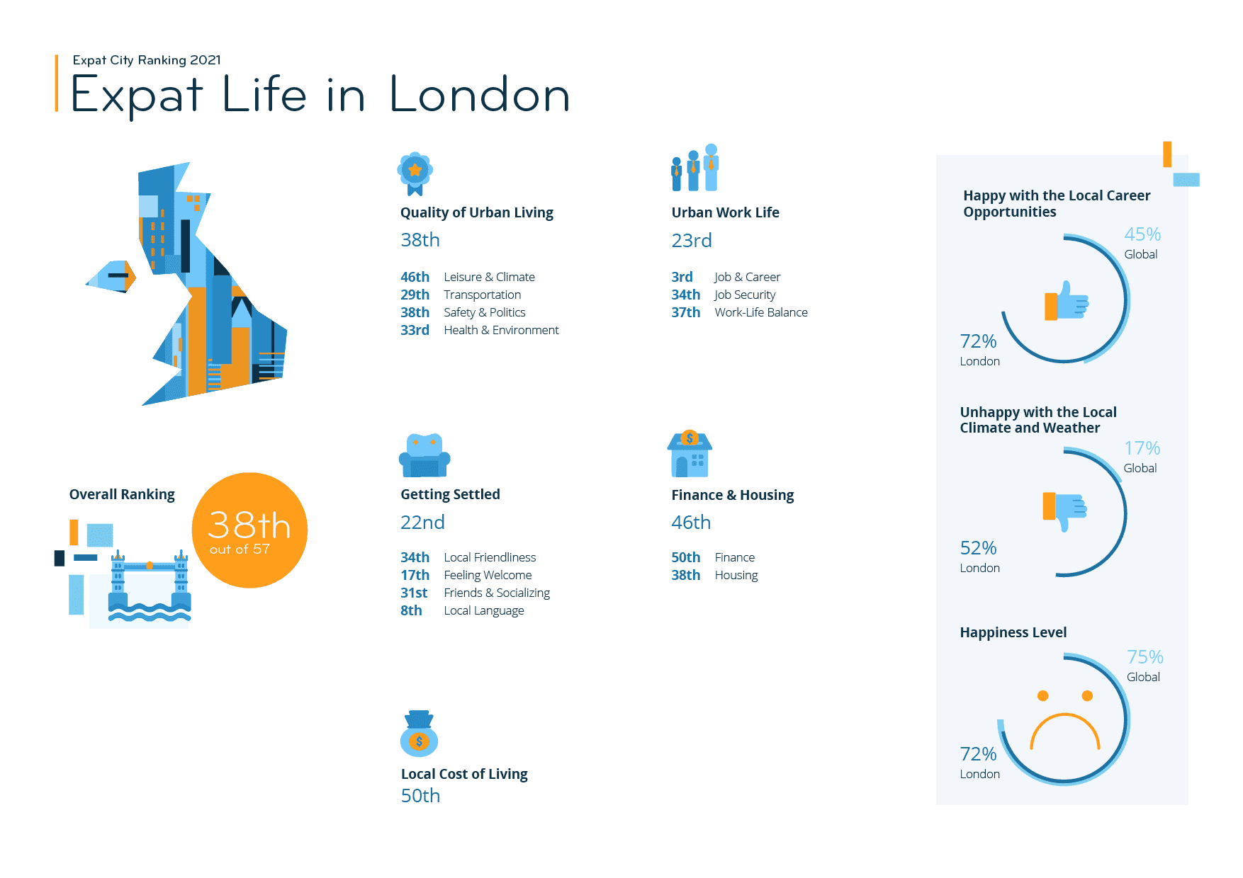 London performs best in the Getting Settled Index (22nd): expats find it easy to get used to the local culture (72% vs. 65% globally), and 68% feel at home there (vs. 65% globally).