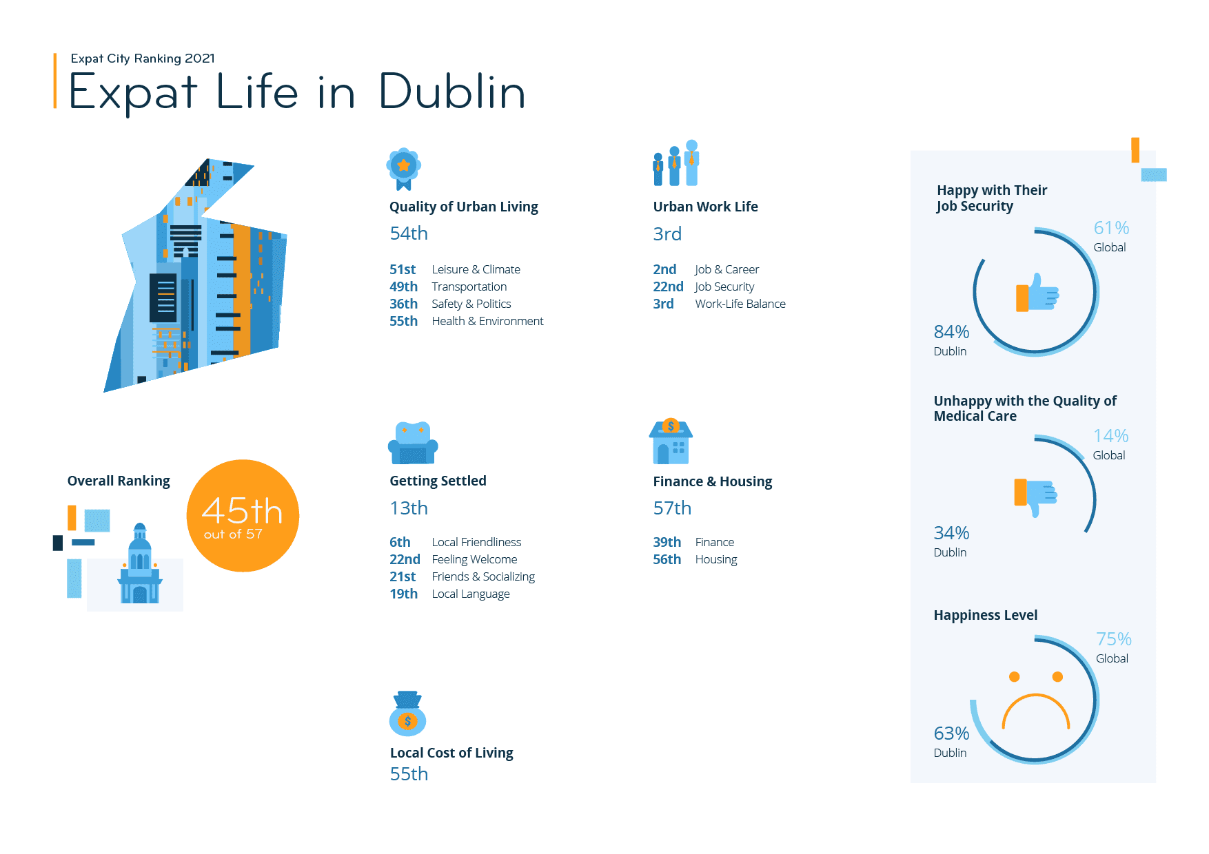 Out of 57 cities in the Expat City Ranking 2021, Dublin comes in a low 45th place. It ranks last in the Finance & Housing Index (57th) and second to last in the Housing Subcategory (56th), only ahead of Munich (57th). Expats find housing in Dublin neither affordable (79% vs. 39% globally) nor easy to find (62% vs. 23% globally). “The housing crisis is a real problem; the rent is simply too high,” a Dutch expat explains. Close to four in five (79%) also rate the local cost of living negatively (vs. 34% globally), with Dublin landing in 55th place in the Local Cost of Living Index.