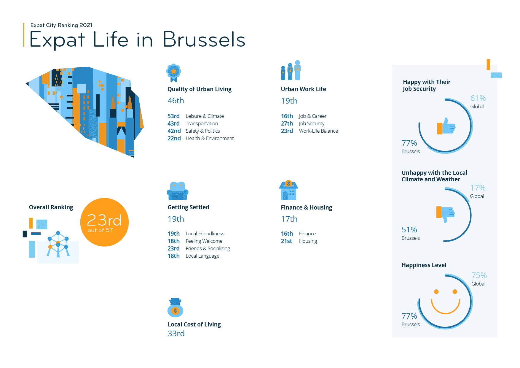 Ranking 23rd out of 57 in the Expat City Ranking 2021, Brussels performs worst in the Quality of Urban Living Index (46th). It ranks among the bottom 10 for the local climate and weather (55th) and for personal safety (50th). In fact, close to one in five expats (19%) do not feel safe in Brussels, compared to 8% globally.