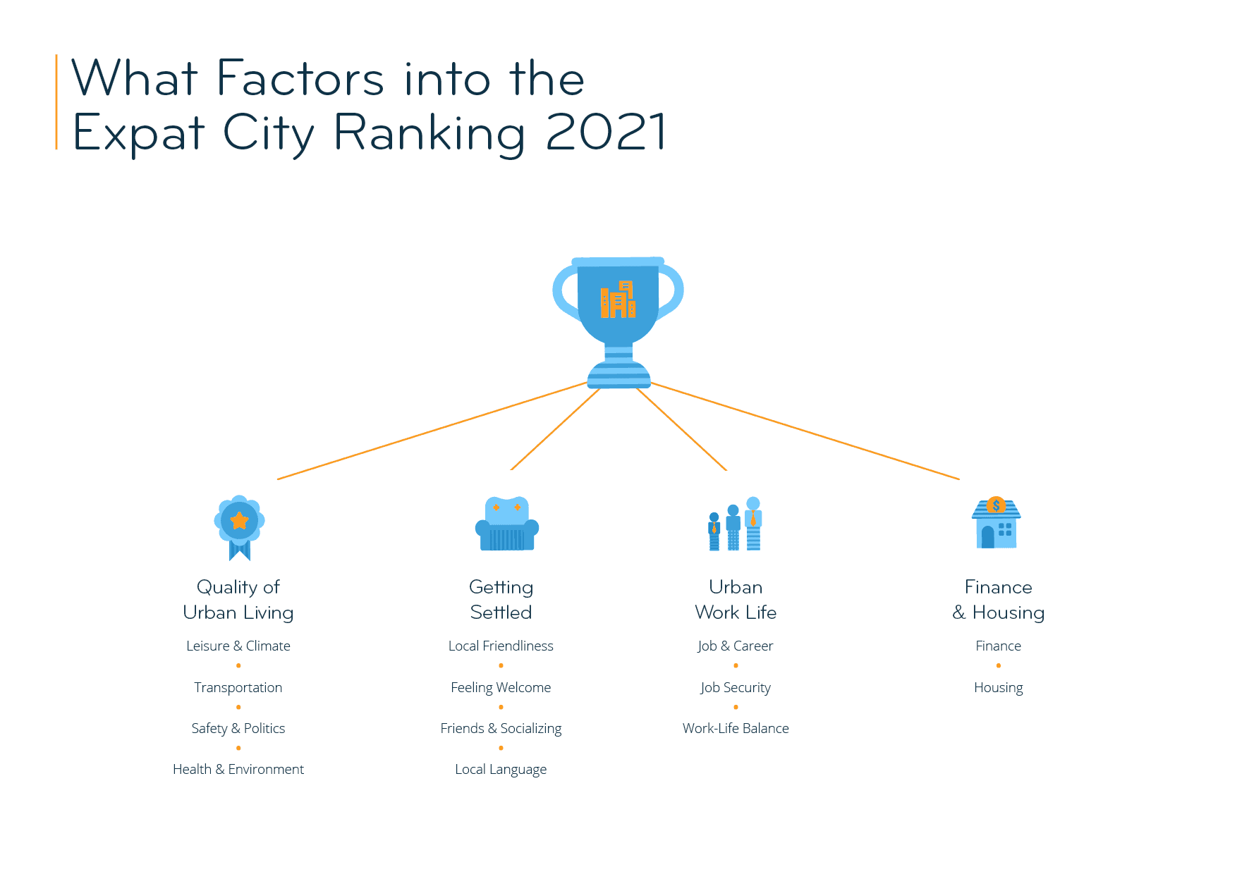 To identify the best and worst cities for expats around the globe, the respondents rated more than 25 different aspects of urban life abroad on a scale of one to seven. The rating process emphasized the participants’ personal satisfaction with these aspects, considering both emotional topics (e.g., the ease of finding friends) and more factual aspects (e.g., the availability of healthcare) with equal weight.