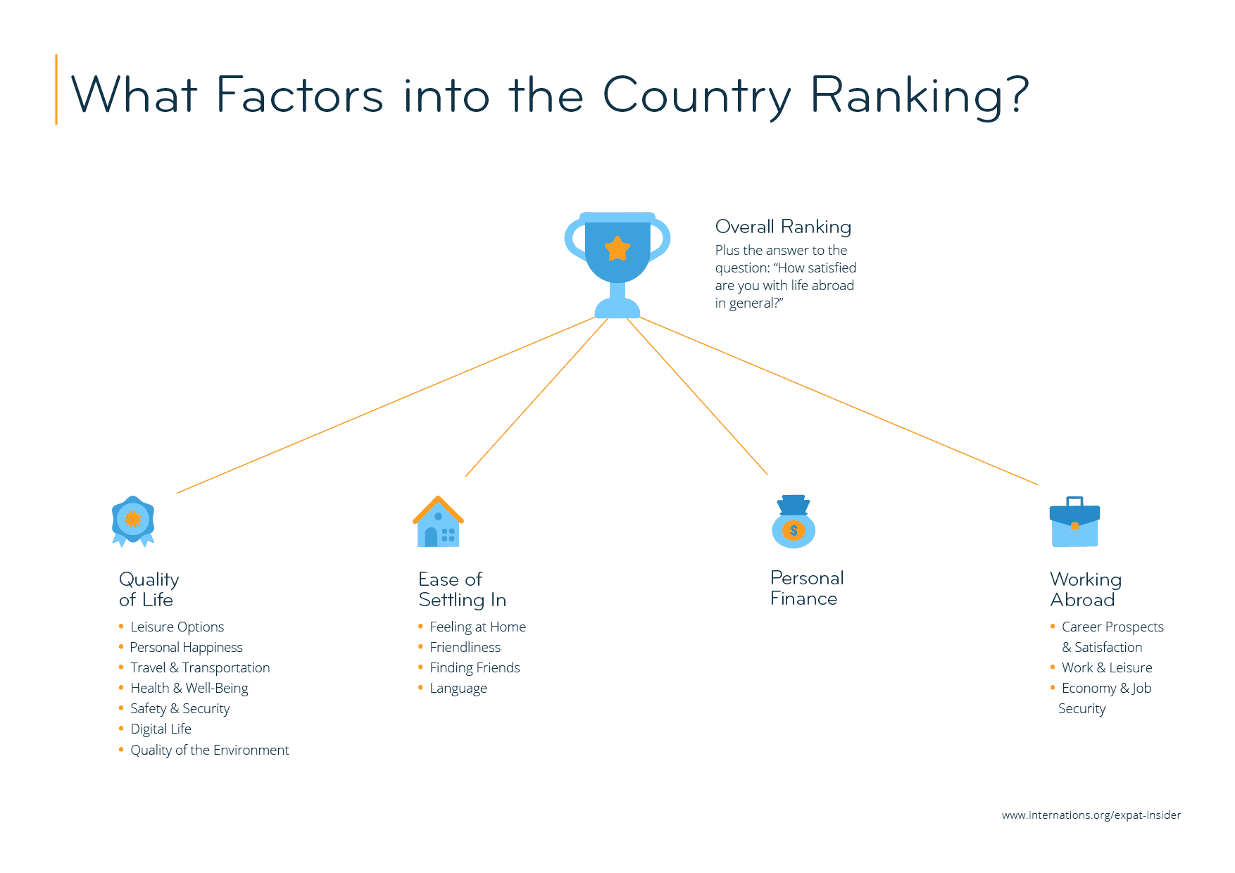 For the rankings themselves, respondents were asked to rate up to 37 different factors related to various aspects of expat life on a scale of one to seven. The rating process emphasizes the respondents’ personal satisfaction with these factors and considers both emotional topics (e.g., getting used to the local culture) and more factual aspects (e.g., transportation infrastructure) with equal weight. The respondents’ ratings of the individual factors were bundled in various combinations for a total of 14 subcategories, and their mean values were used to draw up the four topical indices cited above. (Please note: Unlike previous editions of the Expat Insider survey, the 2021 ranking no longer includes either a separate Family Life Index or individual rating factors aimed only at expat parents.)