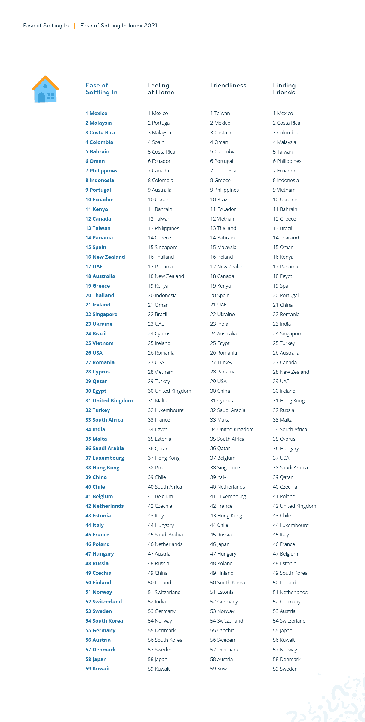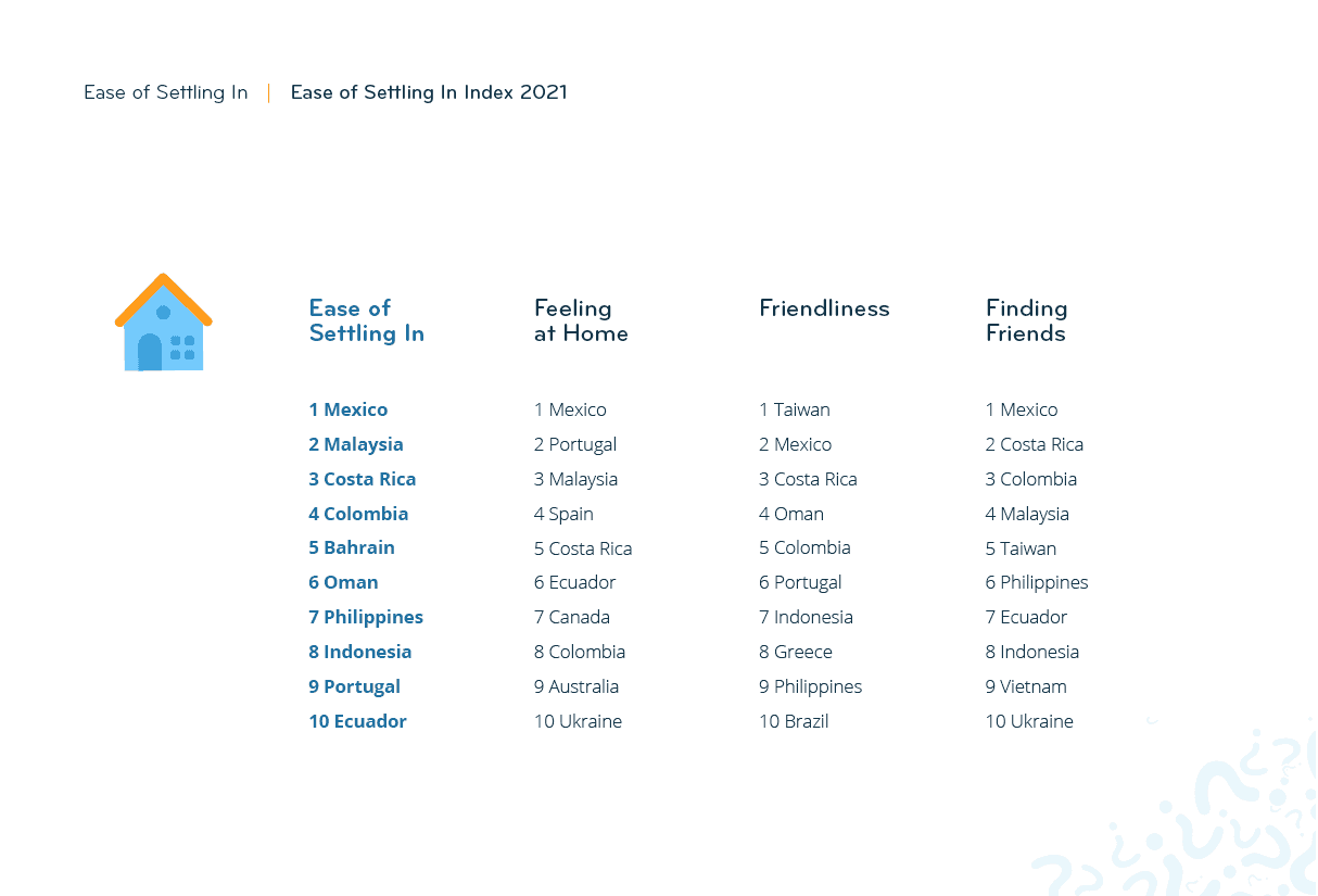 In total, 59 countries and territories have made it into the ranking of the Expat Insider 2021 survey, with a minimum of 50 respondents per destination. The Ease of Settling In Index consists of four subcategories: Feeling at Home, Finding Friends, Friendliness, and Language. Survey respondents rated various factors in each subcategory on a scale from one (very bad) to seven (very good).