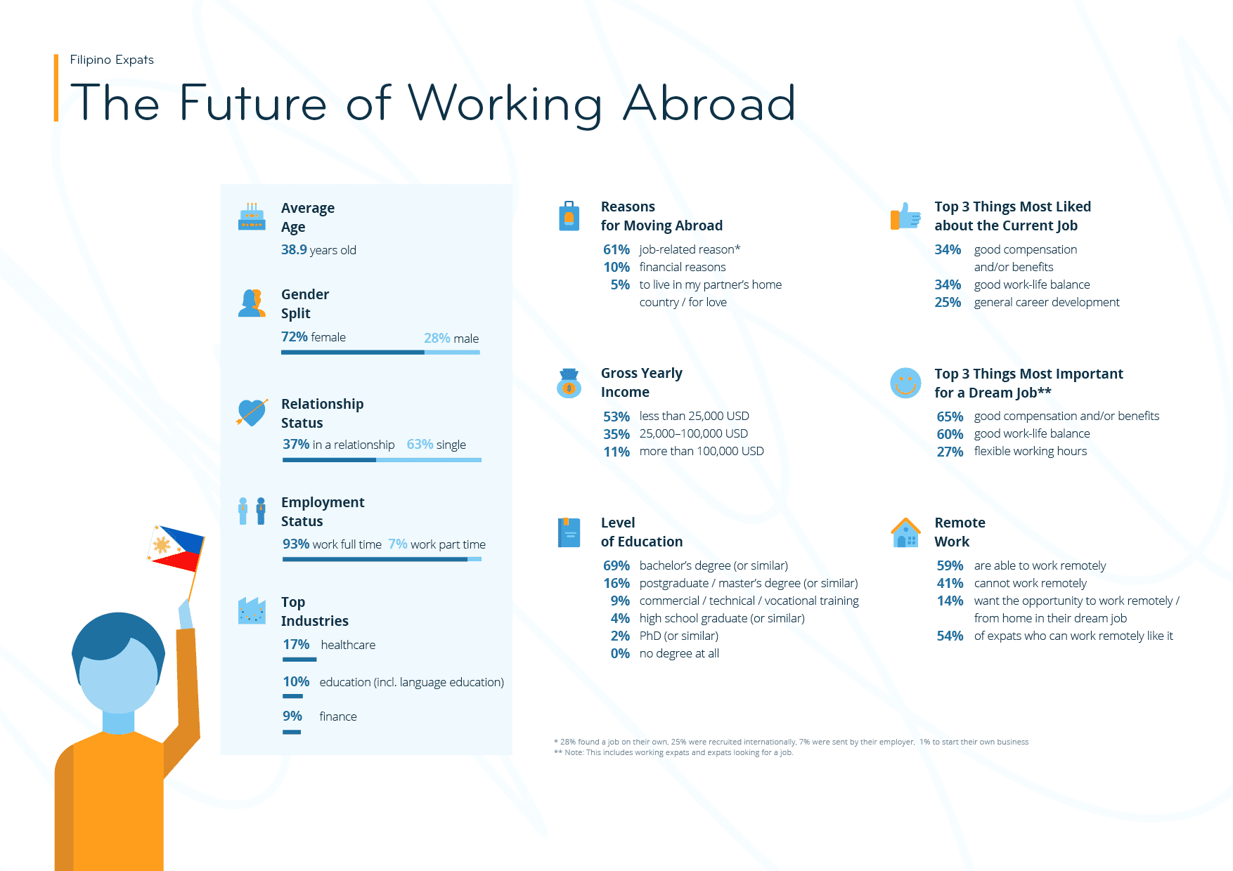 Why do Filipinos move abroad? According to the Expat Insider 2021 survey by InterNations, 61% of Filipinos working abroad name their career as the most important reason for relocating to another country. Globally, just 47% of working expats moved abroad for job-related reasons. Most of these Filipino expats found a job on their own (28%) or were recruited internationally (25%). Just 7% were sent abroad by their employer, and only 1% moved abroad to start their own business. Aside from work-related reasons, an above-average share of Filipinos working abroad (10%) simply moved abroad for financial reasons (vs. 2% globally).