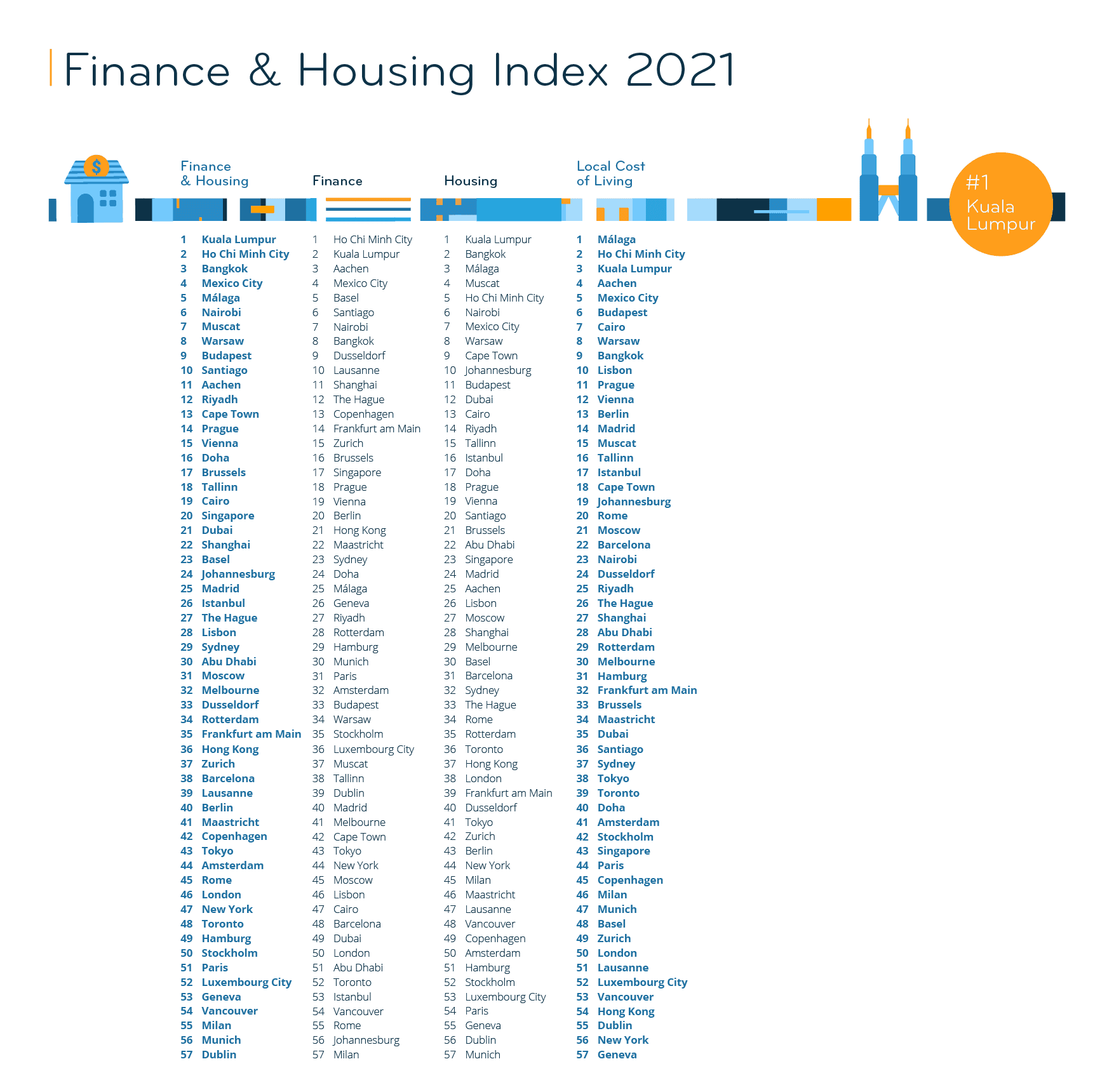Results from the Local Cost of Living Index are mentioned several times below. However, this index is provided purely as additional information. It does not factor into the Finance & Housing Index, nor the overall ranking, to avoid overrepresenting financial aspects in the general results.