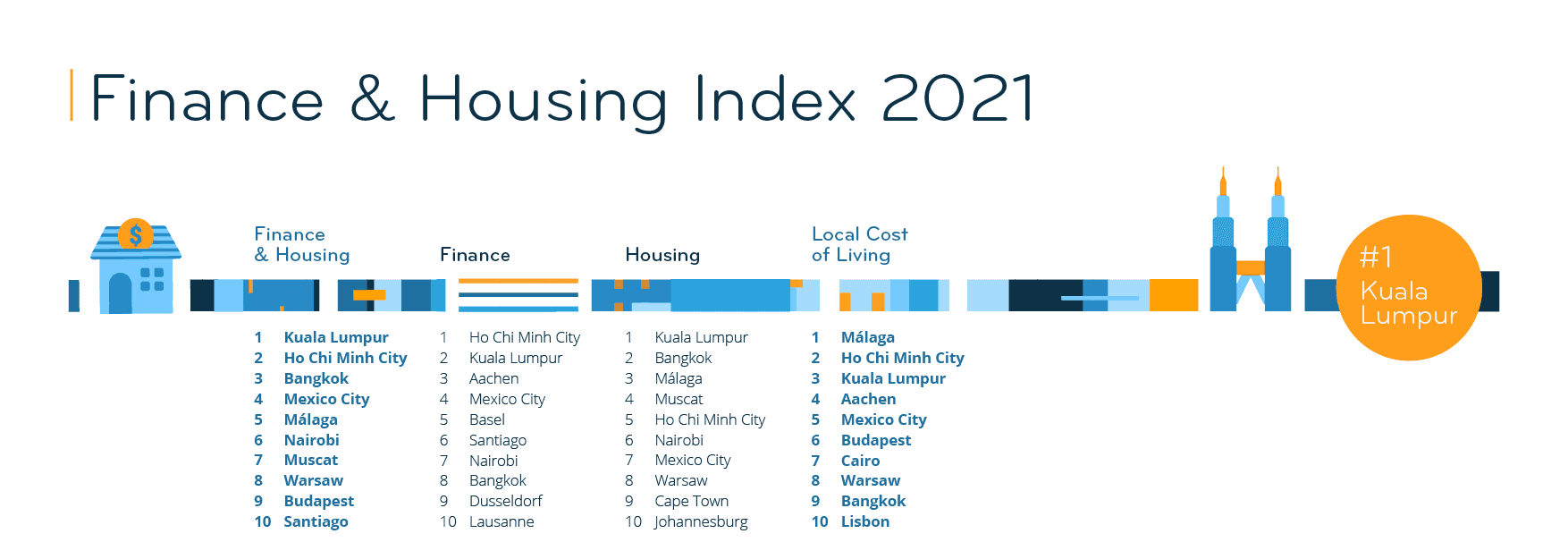 When it comes to affordable living, it doesn’t get much better than the Malaysian capital. Kuala Lumpur continues its winning streak in 2021. In addition to being the overall winner of the Expat City Ranking 2021, this Malaysian city also tops the Finance & Housing Index. It also came in first place in this index in 2020 and has consistently ranked in the top 3 for Finance & Housing since 2017.