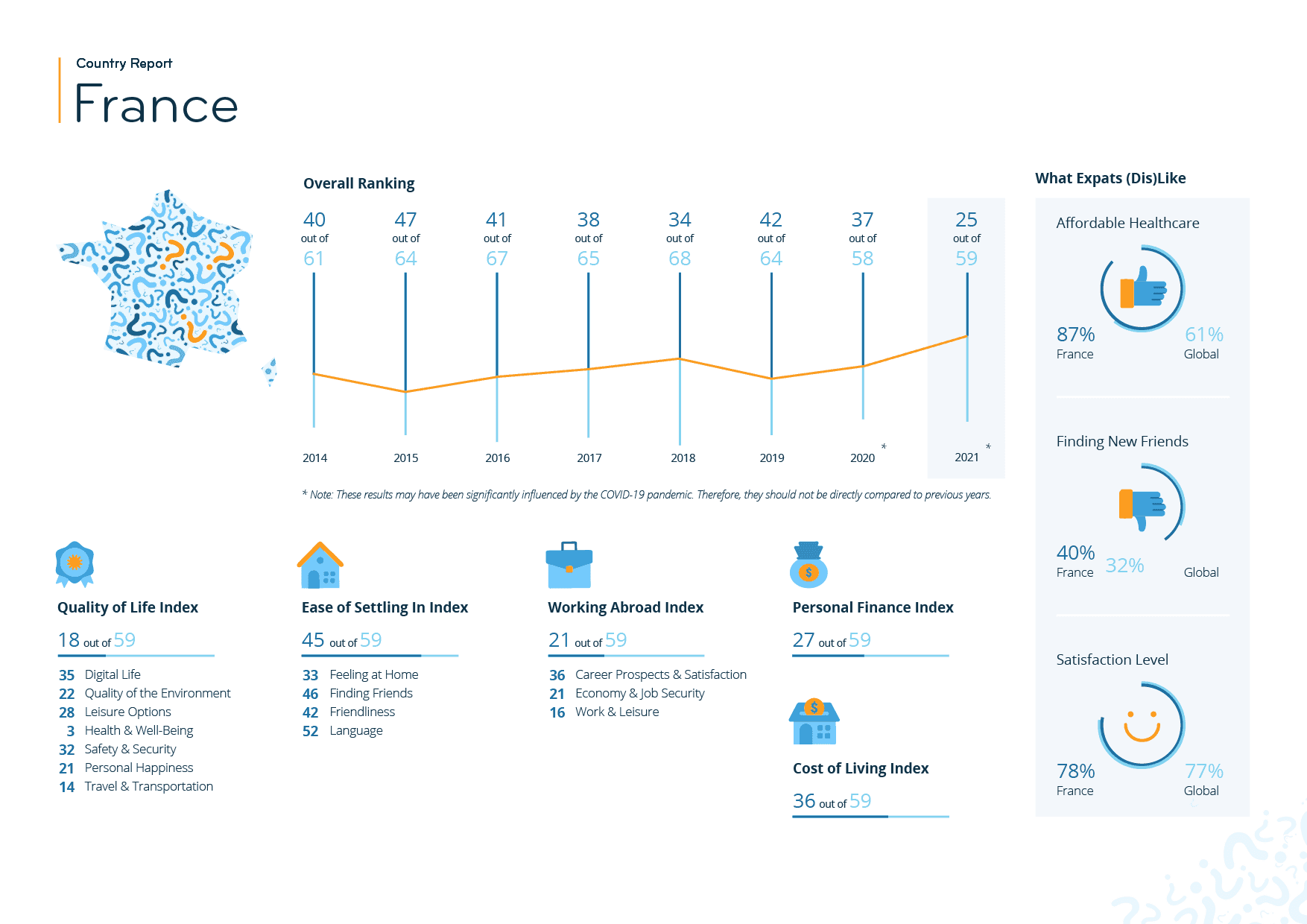 France ranks lowest in the Ease of Settling In (45th) and Cost of Living (36th) Indices. In fact, 38% of expats rate the local cost of living negatively (vs. 34% globally).