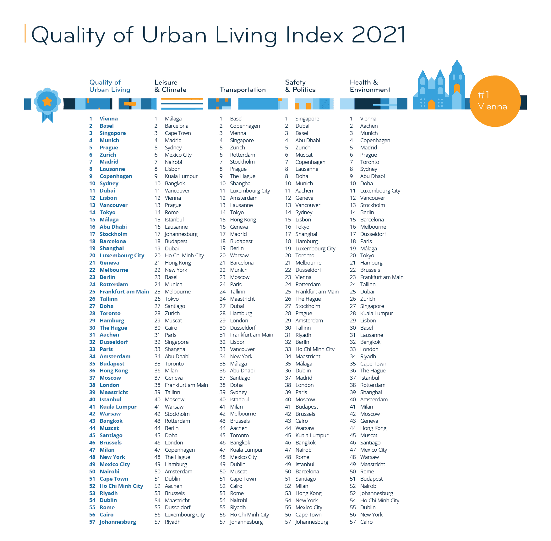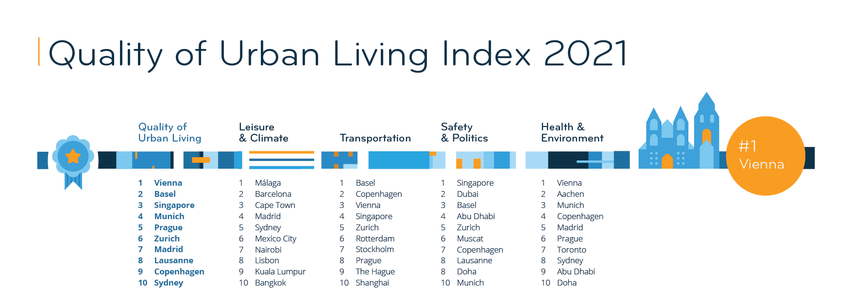Impressively, the Austrian capital has consistently ranked in the top 10 of the Quality of Urban Living Index since 2017. In 2021, Vienna owes its first-place ranking to a variety of aspects — but urban environment and healthcare-related factors stand out most.
