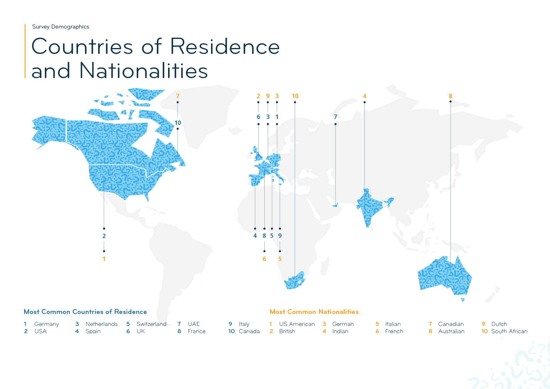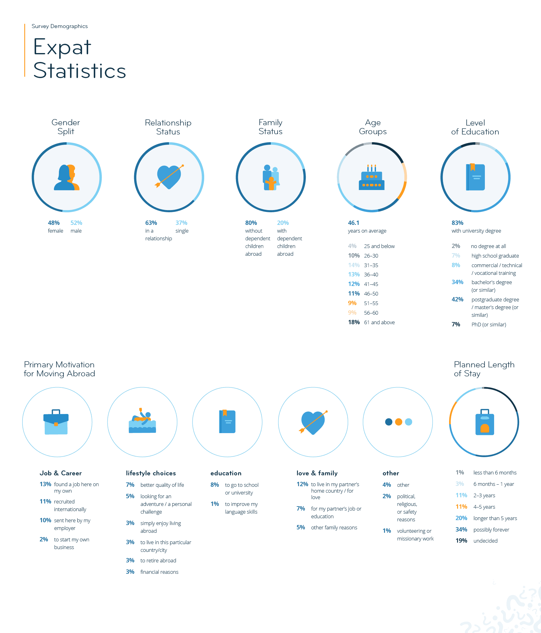 In 2021, a total of 12,420 expats participated in the Expat Insider survey, representing 174 nationalities and living in 186 countries or territories. The infographics below give insights into participants’ demographics, from age and gender to length of stay and level of education, as well as their main reason for moving abroad, and more!