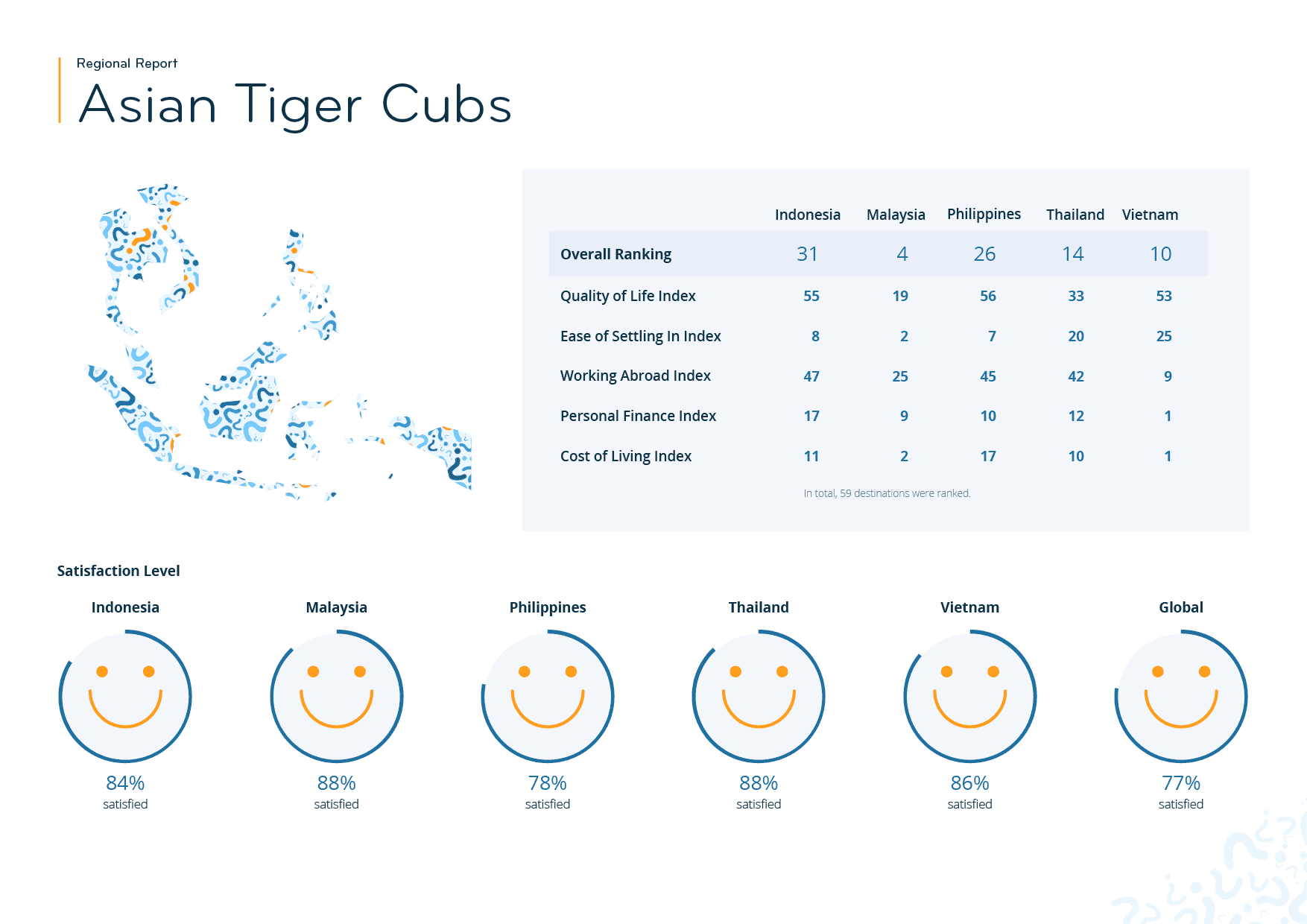 In the Quality of Life Index, three out of five Tiger Cub destinations come in the bottom 10, while Thailand (33rd) is in the midfield in this index and Malaysia (19th) performs the best. Except for Malaysia (31st), they all perform very poorly in the Quality of the Environment subcategory, particularly due to poor results for water and sanitation. Indonesia (58th) and Vietnam (57th) even come in the bottom 3 for this factor, with only 34% of expats in Indonesia satisfied with the water and sanitation (vs. 77% globally). On the other hand, the Asian Tiger Cubs perform comparatively well in the Work & Leisure subcategory, with Indonesia’s 29th place the worst result. Thailand, for example, ranks tenth for work-life balance, with 72% of expats satisfied with this factor (vs. 66% globally).