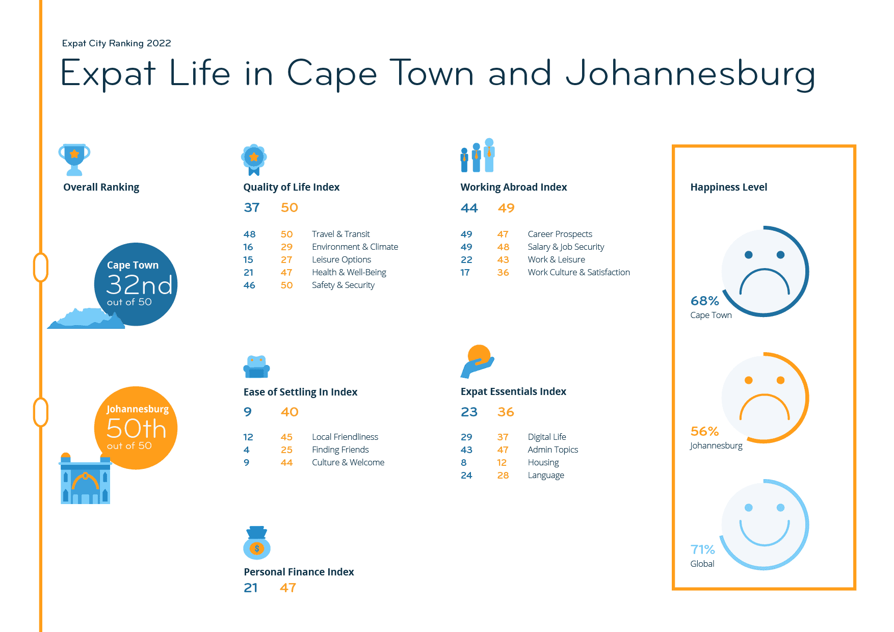 In the Expat Essential Index (23rd), Cape Town ranks among the worst cities in the Admin Topics Subcategory (43rd) but among the best in the Housing Subcategory (8th). In fact, expats describe housing as both affordable (41% happy vs. 39% globally) and easy to find (72% vs. 54% globally).