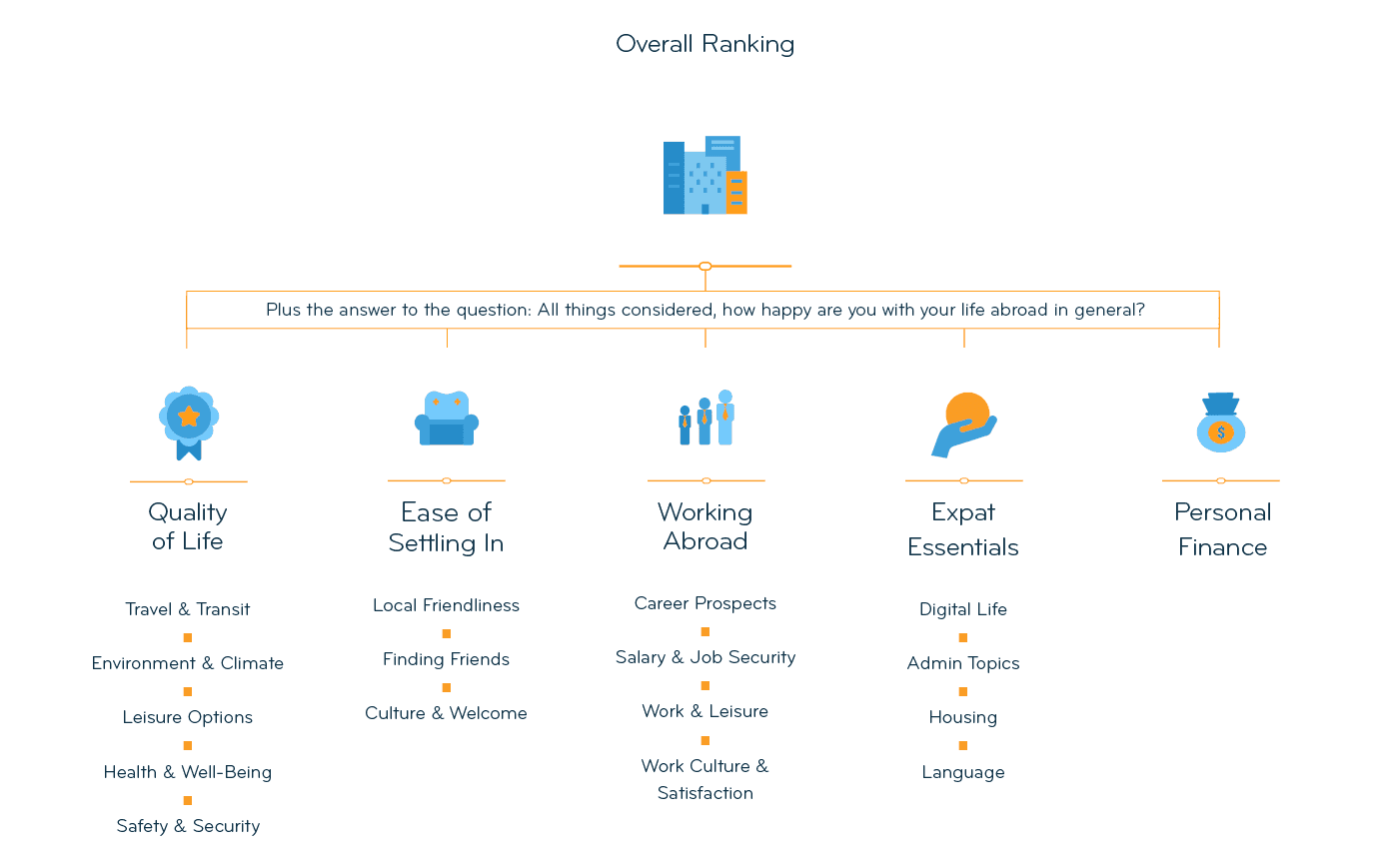 To identify the best and worst cities for expats around the globe, the respondents rated up to 56 different aspects of urban life abroad on a scale of one to seven. The rating process emphasized the participants’ personal satisfaction with these aspects, considering both emotional topics (e.g., the ease of finding local friends) and more factual aspects (e.g., the availability of healthcare) with equal weight.