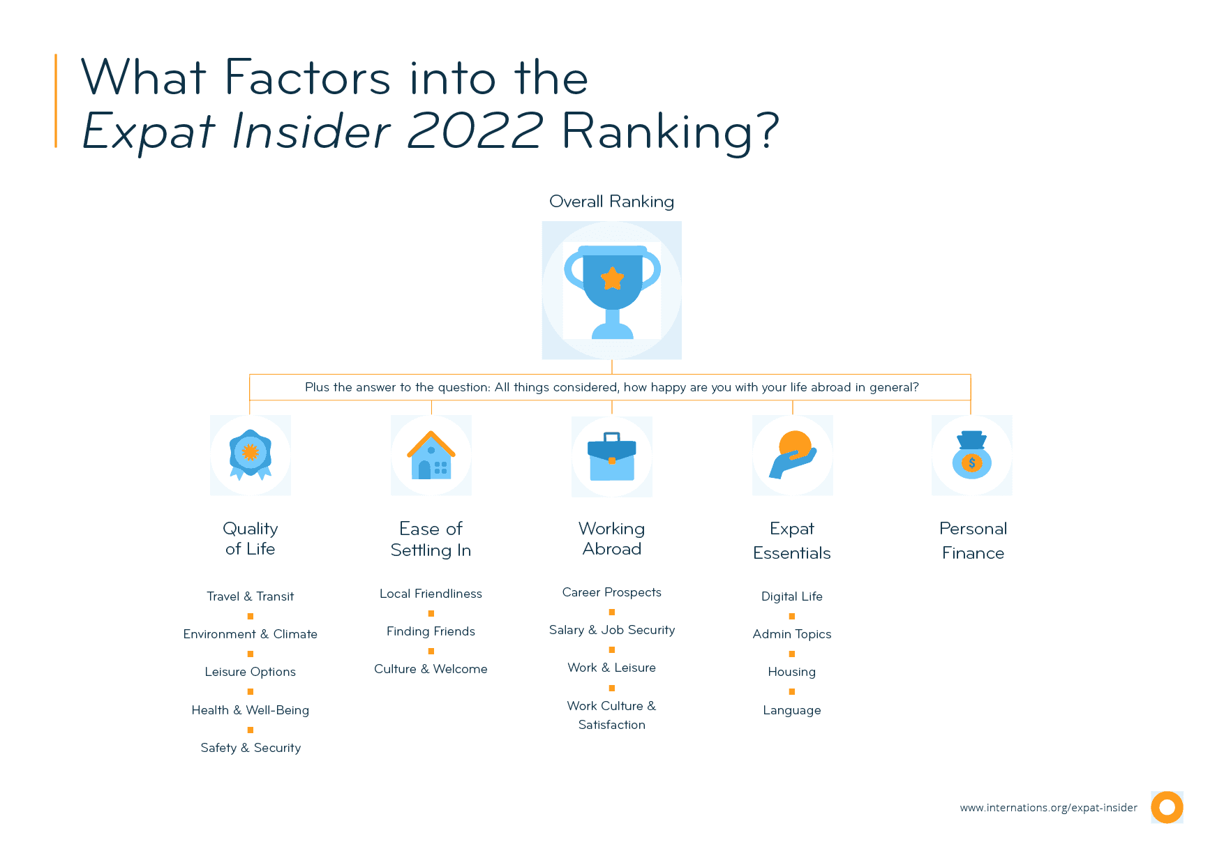 Please also note: The ratings are supposed to compare the survey participants’ individual satisfaction with various factors, instead of comparing related facts from external sources. For example, the factor “personal safety” measures how safe expats feel in their respective destination, but it does not refer to actual crime rates provided by that country’s law enforcement authorities. The resulting ranking is not meant to be an endorsement of any specific destination. It is rather a comparison of how expats rate their everyday life abroad based on their subjective score, and the indices do not cover each and every potential aspect of living abroad. For instance, the questionnaire asked respondents to give their views on selected factors such as political stability, unrestricted online access, and the general ability to freely express themselves and their opinions. But the vast field of political issues — e.g., questions of censorship or human rights — is not explored in any depth in this survey.