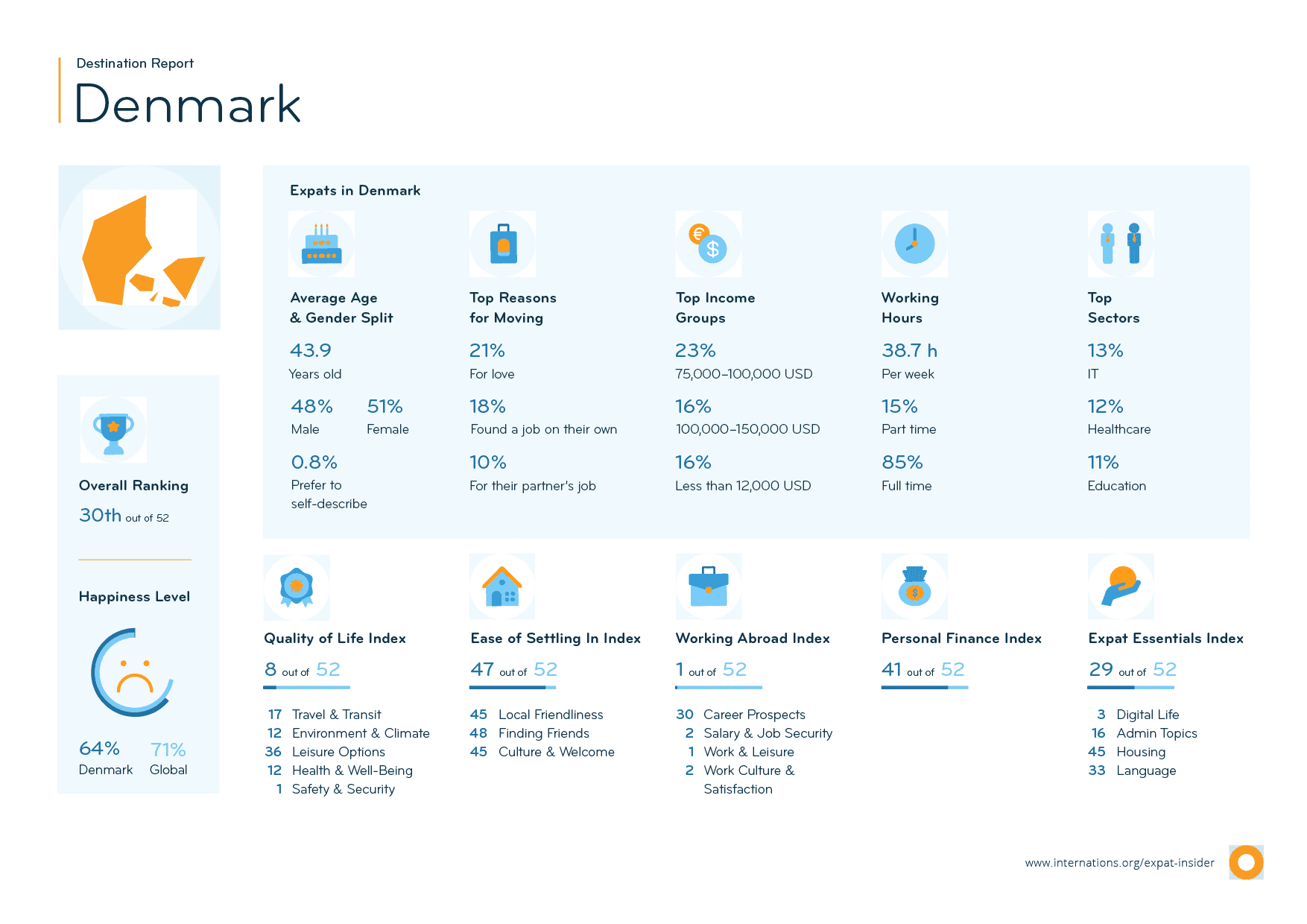 In the Ease of Settling In Index, Denmark does even worse. Ranking 47th out of 52, it ends up among the bottom 10. About one in four expats (23%) describe the local population as generally unfriendly (vs. 17% globally), and 28% perceive it as unfriendly towards foreign residents (vs. 18%).