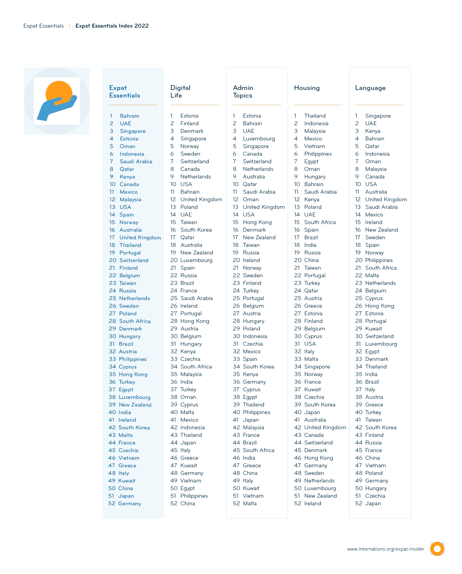 The only Gulf State not featured in the top 10 even ends up among the bottom 10: Kuwait (49th) is one of the worst-rated countries in this index, largely due to Admin Topics (50th) and Digital Life (47th). Its best result is a 29th place for Language.