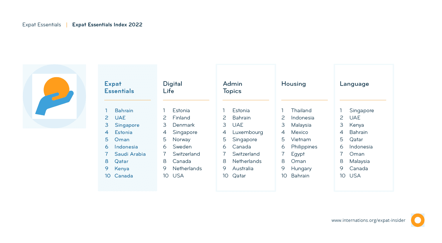 With Singapore, another expat hub makes it into the top 3. The city-state shines in three of the four subcategories. It even places first for Language — probably because English is one of its official languages.