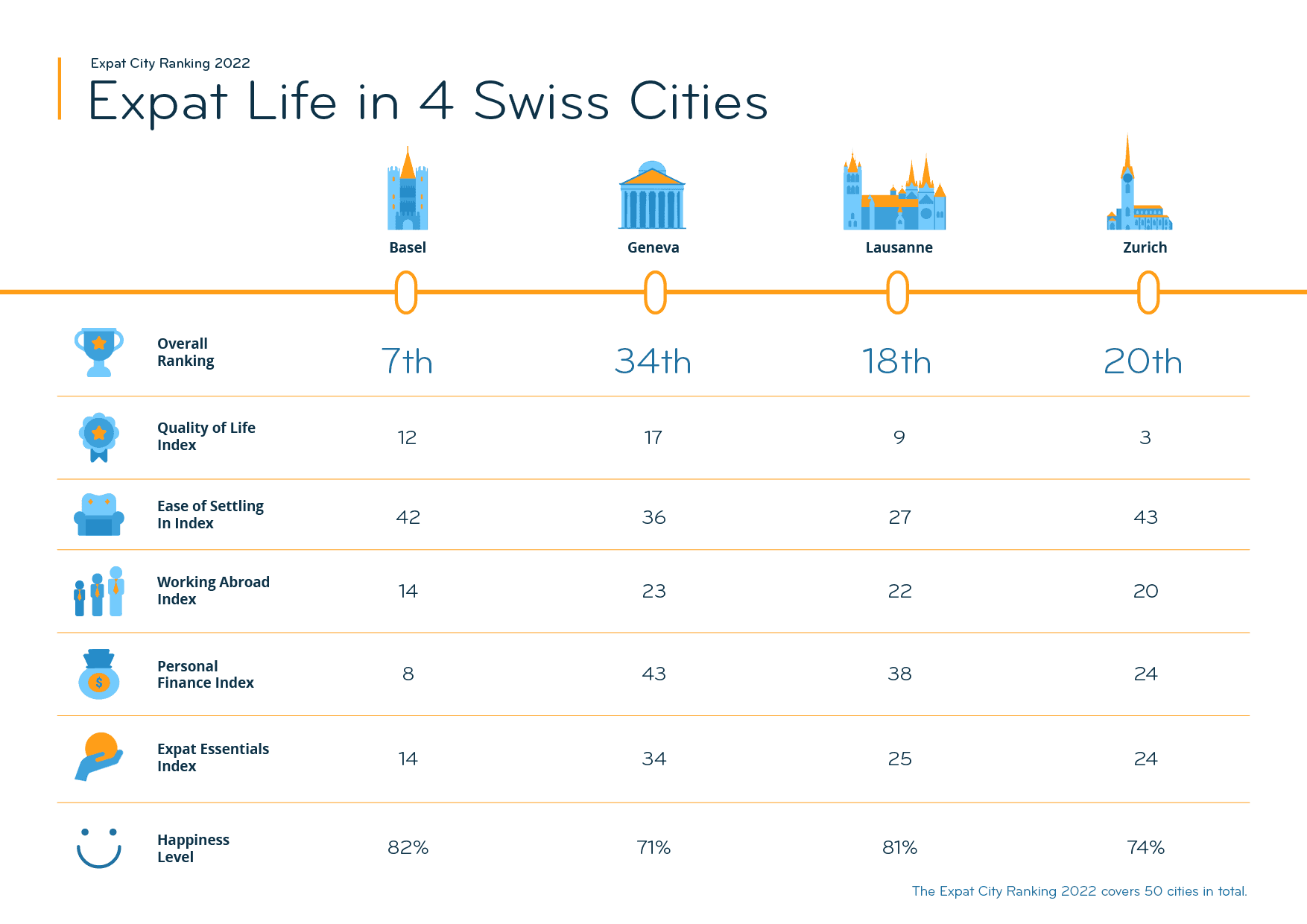 Similar to the other Swiss cities, Geneva does well in the Working Abroad (23rd) and Quality of Life (17th) Indices. It even comes third worldwide in the Safety & Security Subcategory: expats are satisfied with the political stability (89% happy vs. 64% globally) and feel that they can openly express themselves and their opinions (79% vs. 64% globally). They also appreciate the natural environment (96% happy vs. 83% globally), as well as the air quality (80% vs. 65% globally), and 86% believe that the government supports policies to protect the environment (vs. 61% globally). On the downside, Geneva ranks 44th in the Leisure Options Subcategory. While 84% rate the opportunities for recreational sports positively (vs. 75% globally), they are dissatisfied with the culinary variety and dining options (17% unhappy vs. 12% globally), as well as the city’s culture and nightlife (28% vs. 16% globally).