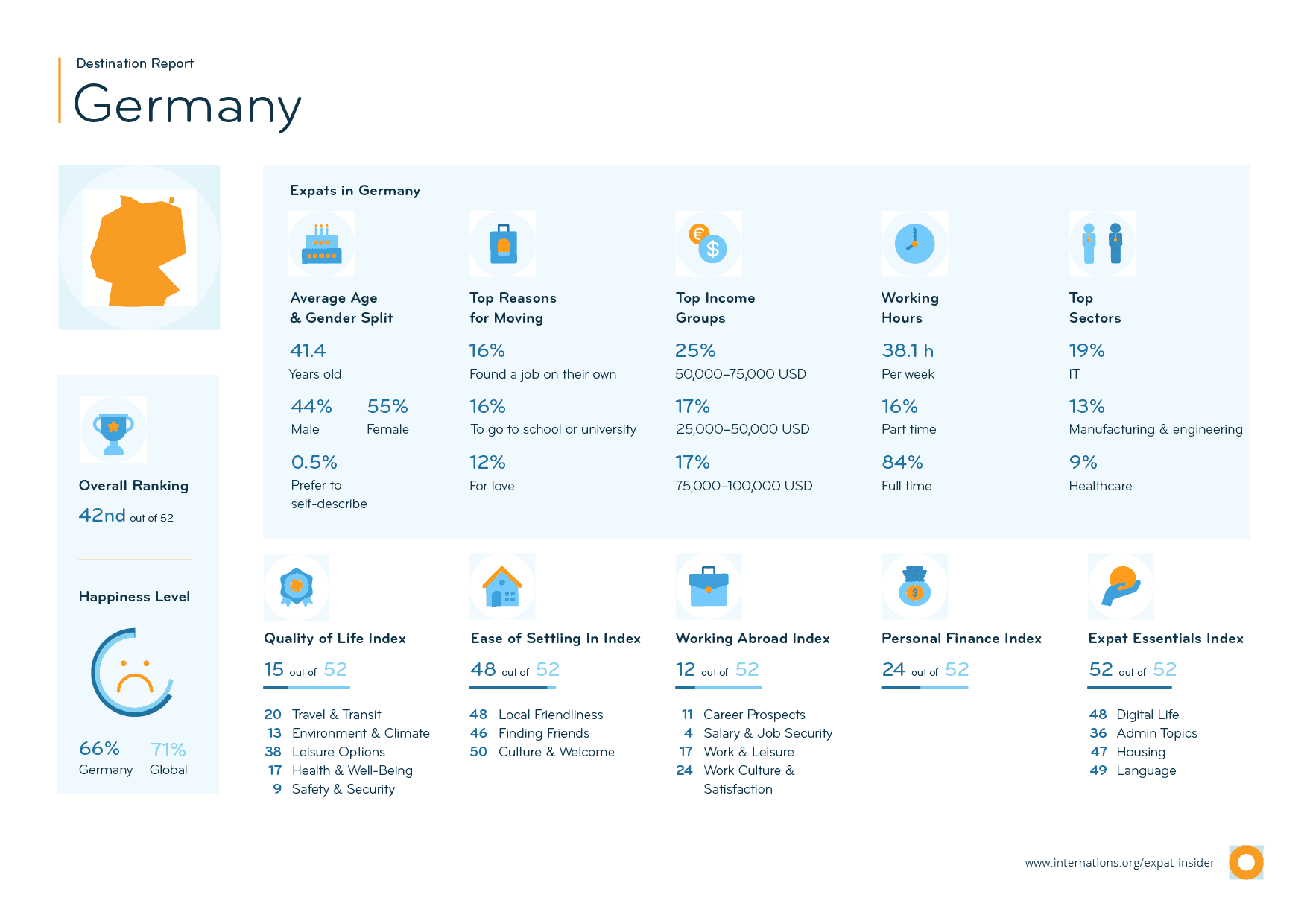 Overall, Germany lands in a below-average 42nd place out of 52 in the Expat Insider 2022 survey and even ranks last in the Expat Essentials Index (52nd). This crushing verdict is due to its bottom 10 results in three out of four subcategories: Housing (47th), Digital Life (48th), and Language (49th).