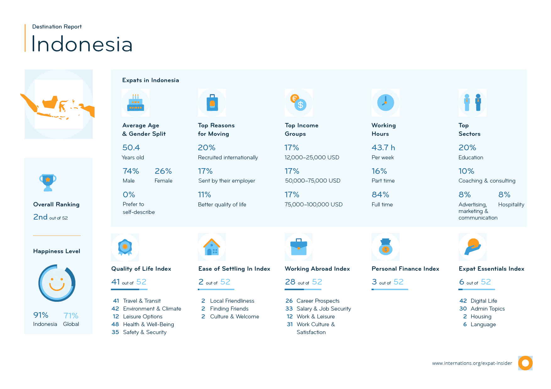 The country’s great performance in the Expat Essentials Index (6th) is mainly due to two aspects: First, while only 49% find it easy to live in Indonesia without speaking the local language, which is just about average (51%), 73% say it is easy to learn (vs. 41% globally). In fact, 53% speak the local language very or fairly well. Second, housing is easy to find (84% vs. 54% globally) and to afford (74% vs. 39% globally). Beyond housing, 73% of expats are happy with the general cost of living (vs. 45% globally), and 64% say that their disposable household income is more than enough to lead a comfortable life (vs. 45% globally). “It is a great opportunity to save due to the low living expenses,” shares an expat from South Korea.