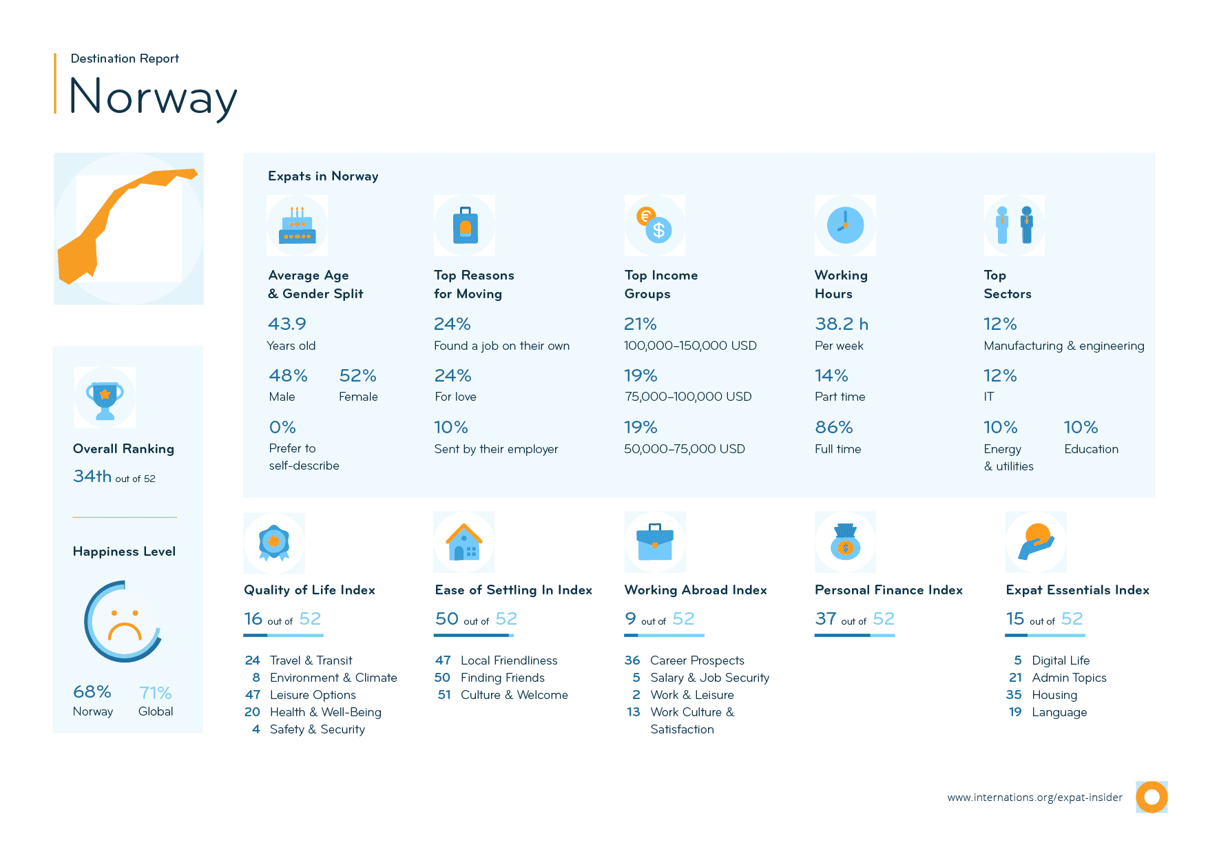 Dealing with the local authorities in general does not seem to pose many problems for expats in Norway (68% happy vs. 40% globally). However, the same cannot be said about all the factors in the Admin Topics Subcategory (21st). For example, expats struggle with opening a local bank account (28% unhappy vs. 21% globally). Lastly, the Housing Subcategory (35th) is Norway’s weakest spot: only 51% consider housing easy to find for expats (vs. 54% globally), while 48% describe it as hard to afford (vs. 43% globally).