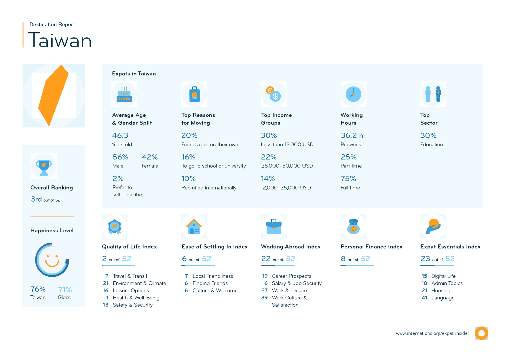 While Taiwan only comes 22nd in the Working Abroad Index, it gets another top ranking for one of its factors: 85% of expats feel paid fairly for their work (based on industry, qualifications, role, etc.), compared to 62% globally. This also might explain why they are satisfied with their financial situation (70% vs. 60% globally), and 55% state that their disposable household income is enough to lead a comfortable life (vs. 45% globally). “It is less expensive here to enjoy a high-quality, modern standard of living, including healthcare, fitness, food, and so on,” shares a US American expat.