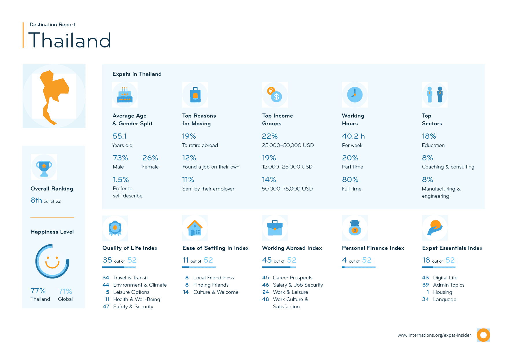 Expats also rank Thailand among the bottom 10 for Salary & Job Security (46th). More than three in ten (31%) are unhappy with the state of the local economy, compared to only 17% globally. Additionally, one in four expats (25%) is unsatisfied with their job security (vs. 20% globally). However, 35% of expats do not have to worry about this, as they are already retired, compared to the global average of 10% retirees. In fact, 19% of expats in Thailand moved there specifically to retire, compared to only 3% globally.