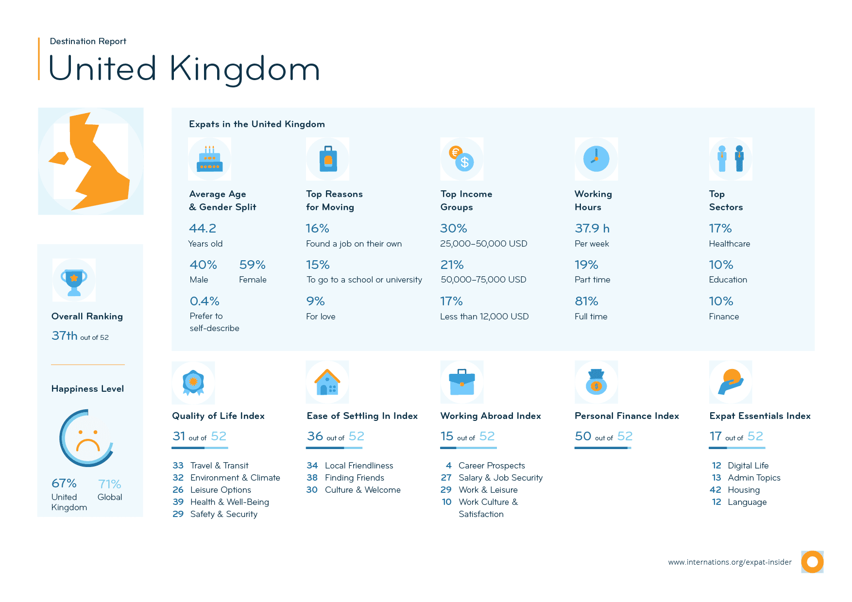 Expats also struggle with the climate and weather (47th) in the UK. Two in five (40%) are unhappy with this factor, 21 percentage points more than the global average. “The weather is difficult, and during the winter the lack of daylight can be depressing,” a Chinese expat explains.