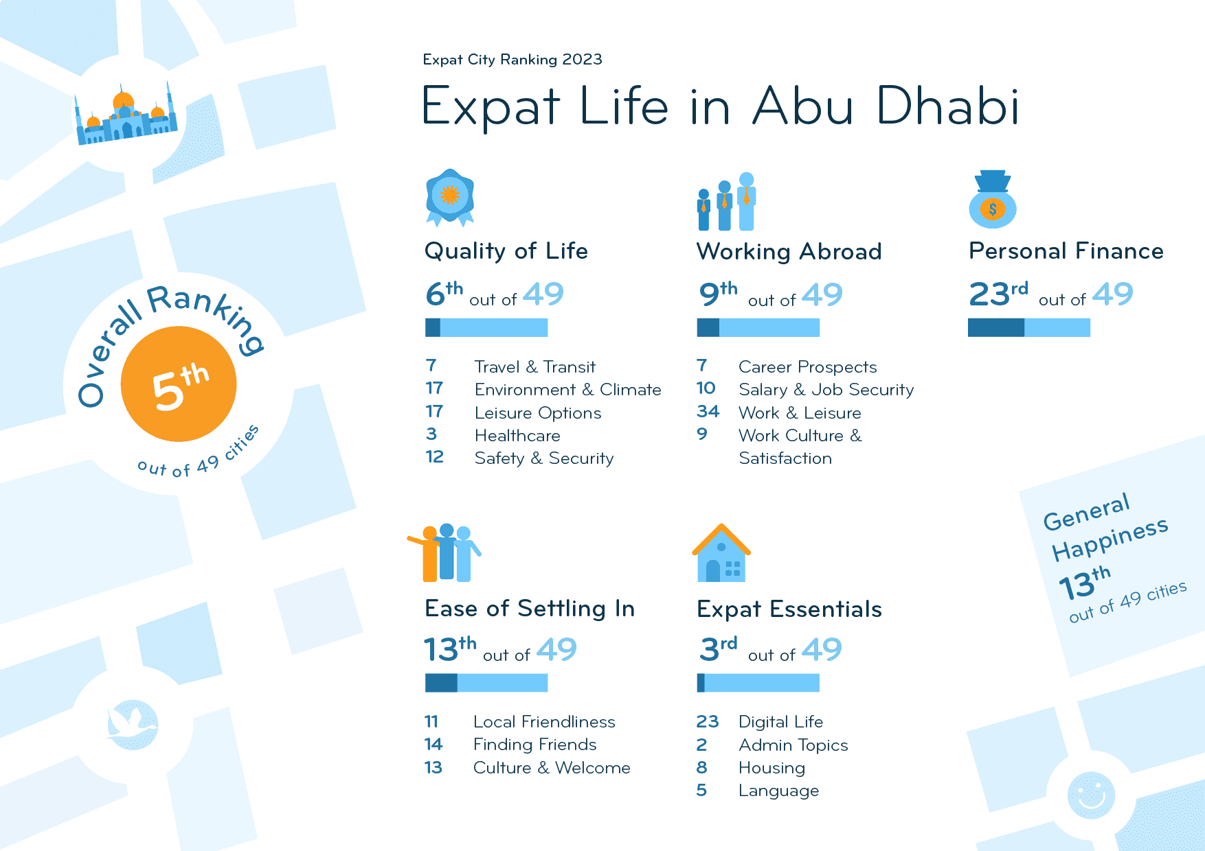 Abu Dhabi places 5th out of 49 in the Expat City Ranking 2023. Among the Gulf State cities compared in this ranking, Abu Dhabi offers the highest Quality of Life (6th). It has the best infrastructure for cars in the world (1st), and expats rate Abu Dhabi among the top 3 for medical services: 88% are happy with the quality (vs. 70% globally) and 90% with the availability of healthcare (vs. 71% globally). On top of that, 94% value their personal safety (vs. 83% globally) and 84% the political stability (vs. 63% globally).