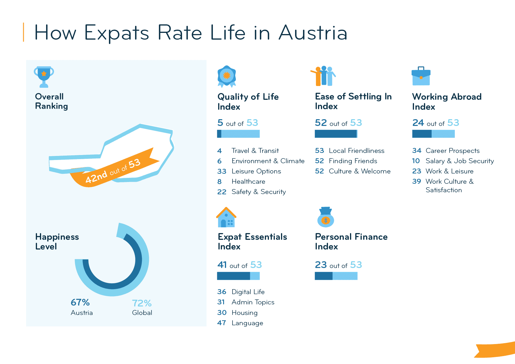 Austria comes 42nd out of 53 destinations in the Expat Insider 2023 survey, making it into both the top and bottom 10 worldwide. It is among the countries offering the best Quality of Life (5th) but is one of the worst for the Ease of Settling In (52nd) as an expat. While it ranks only slightly better in the Expat Essentials Index (44th), it comes 24th for Working Abroad and 23rd for Personal Finance. Overall, 67% are happy with their life in Austria, compared to 72% globally.