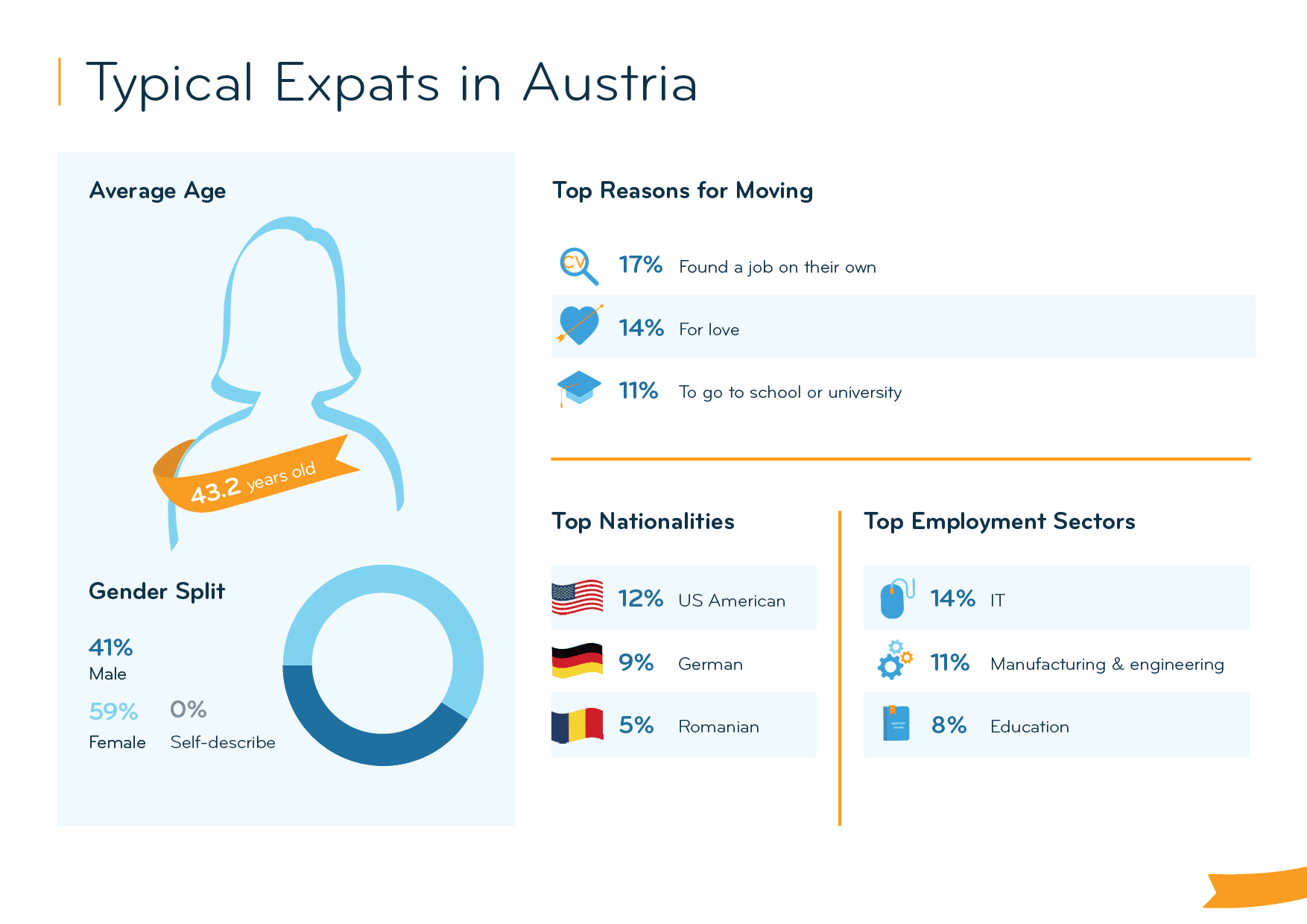 This probably explains why 58% of expats find it hard to make local friends in Austria (vs. 36% globally), and 32% have no personal support network there (vs. 24% globally). It is then hardly surprising that 33% do not feel welcome in Austria, more than twice the global average (15%).