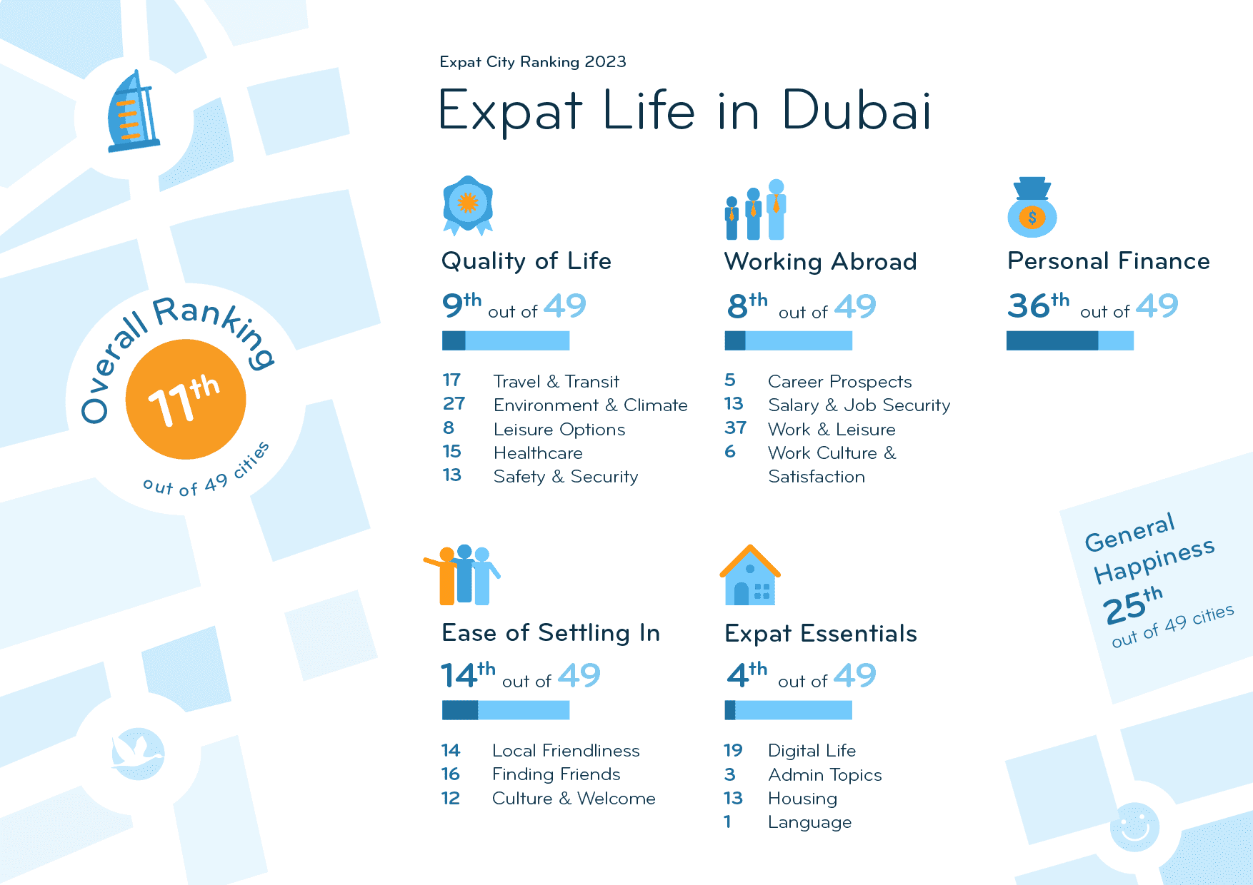 Dubai places 11th out of 49 in the Expat City Ranking 2023. The UAE’s expat hub gives its newcomers an easy start, according to the Expat Essentials Index (4th). Dealing with Admin Topics (3rd) is super simple, and it’s the easiest place in the world to get a visa (1st). Although expats are quite happy with the availability of government/administration services online (3rd), the city is in the bottom 3 (47th) for unrestricted access to online services like social media.