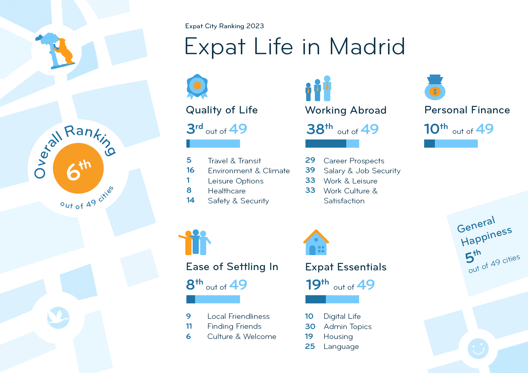The Spanish capital ranks 6th out of 49 in the Expat City Ranking 2023. Digital Life (10th) in Madrid is a particular highlight. Expats find it easy to pay without cash (6th), get high-speed internet access at home (6th), and have unrestricted access to online services (7th).