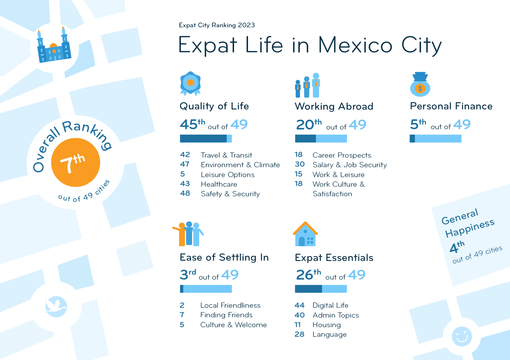 Overall, Mexico City places 7th out of 49 in the Expat City Ranking 2023. It’s the place with the 2nd friendliest population, and it ranks among the top 10 for its general cost of living (7th). Personal Finances (5th) are indeed a breeze for expats: three in four (75%) are happy with their financial situation there (vs. 58% globally).