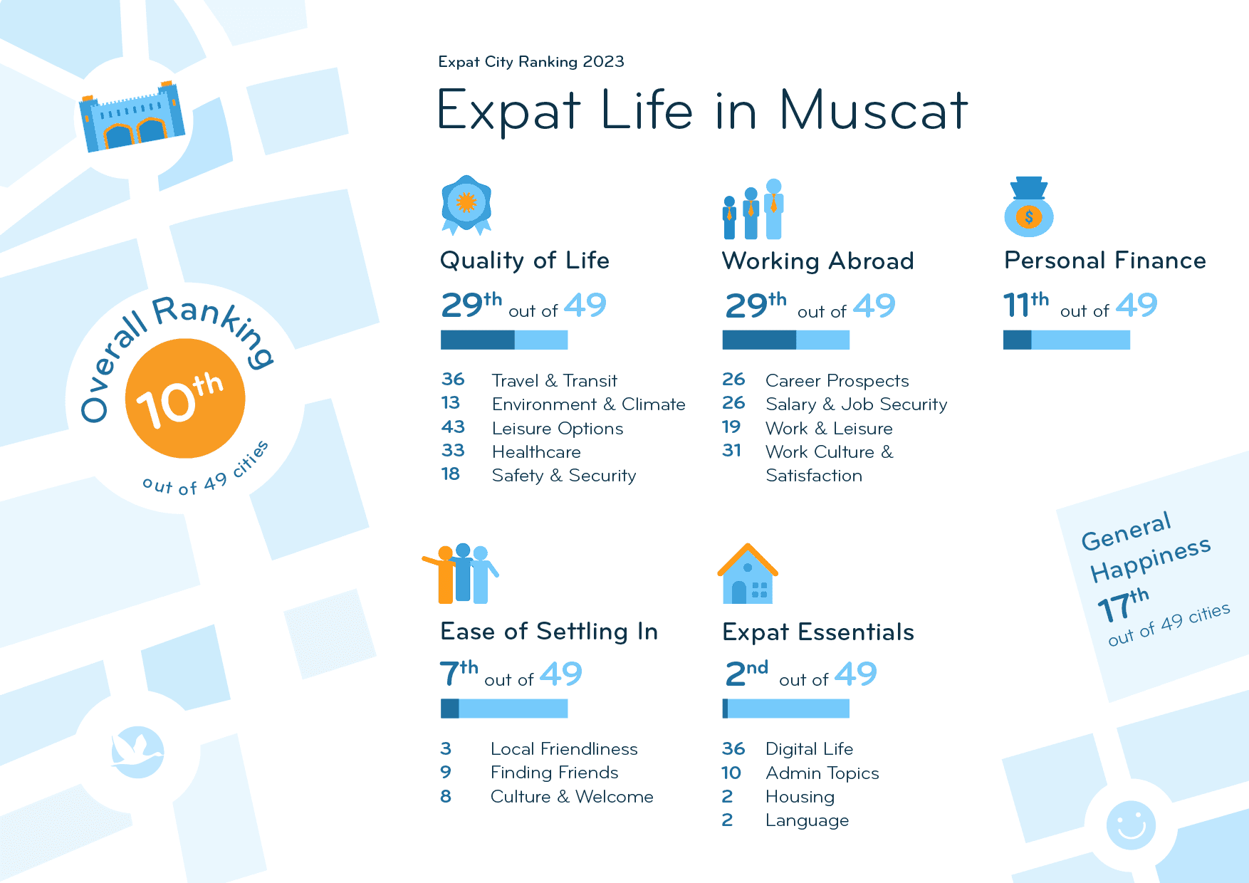 Muscat places 10th out of 49 in the Expat City Ranking 2023. Its best performance is in the Expat Essentials Index (2nd), where it excels in the Admin Topics Subcategory (10th): 76% of expats in Muscat say it’s easy to open a bank account (vs. 62% globally), while about half (51%) find it easy to deal with the local bureaucracy (vs. 39% globally).