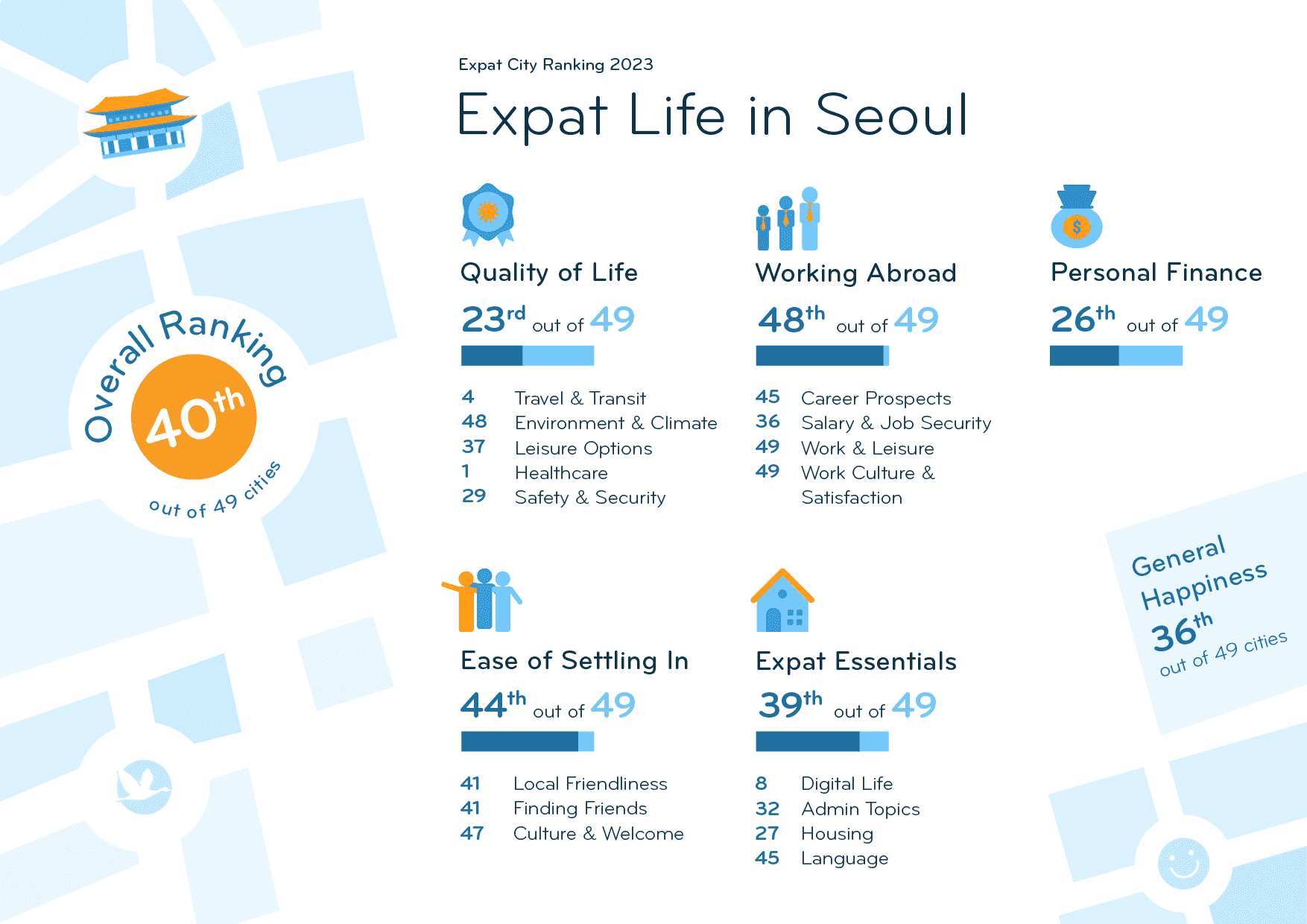 Seoul ranks 40th out of 49 in the Expat City Ranking 2023. It performs worst for Working Abroad (48th), and even comes in dead last for work-life balance (49th). Close to two in five respondents (37%) are unhappy with their working hours, over twice as many as the global average (16%). In fact, expats with a full-time job there work close to two hours more in a week than the global average (44.5 h vs. 42.7 h worldwide).