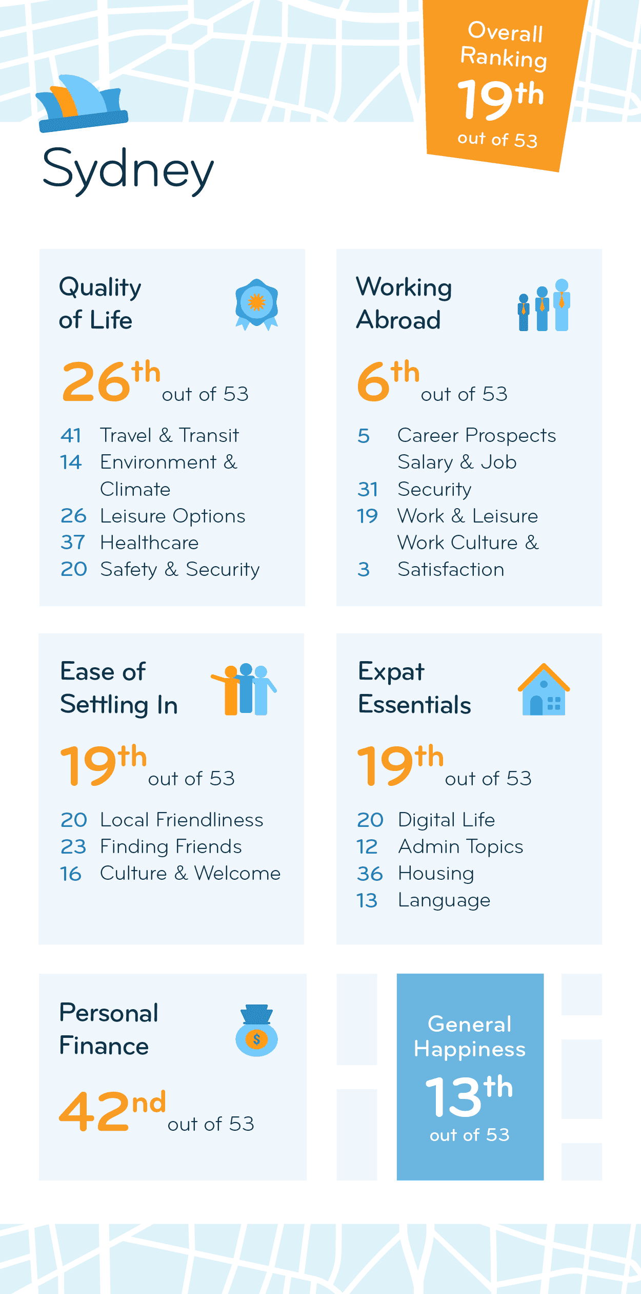 Sydney ranks 19th in the Ease of Settling In Index. Close to three-quarters of expats (73%) feel welcome there, 10 percentage points above the global average of 63%. And the city ranks 20th both for the general friendliness of the residents and the ease of making local friends.