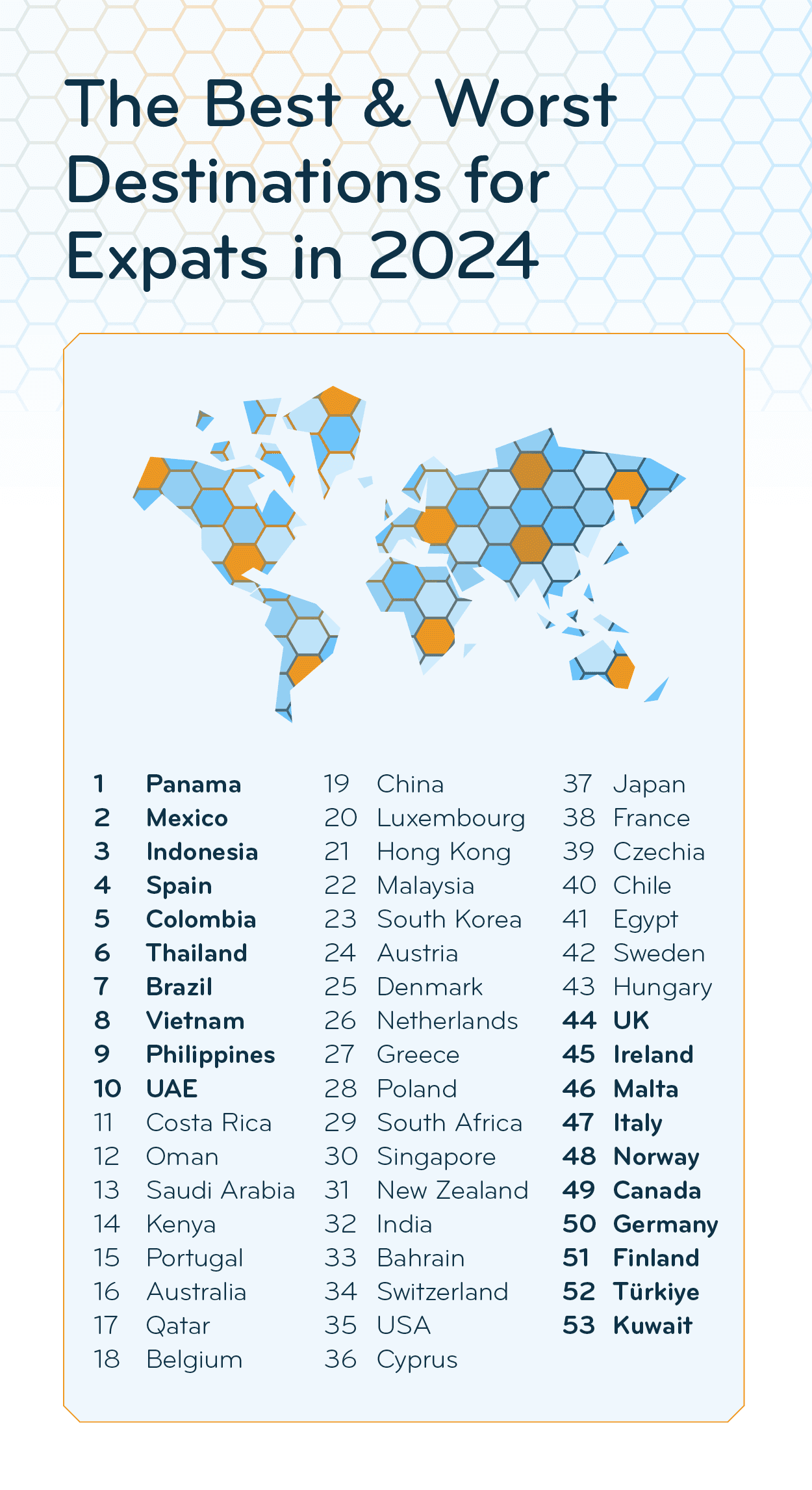 Over two-thirds of expats (68%) moved to Kuwait for job-related reasons (vs. 35% globally). But its 50th place in the Working Abroad Index doesn’t inspire a lot of confidence. Only 43% of respondents are satisfied with their working hours (vs. 62% globally) — on average, expats in a full-time position in Kuwait work 47.8 hours a week, over five hours more than the global average of 42.5 hours. Kuwait ranks even lower for Work Culture & Satisfaction, in 53rd place, suggesting that overall job satisfaction (51st) and flexibility in the workplace (52nd) might not meet expectations for many expats.