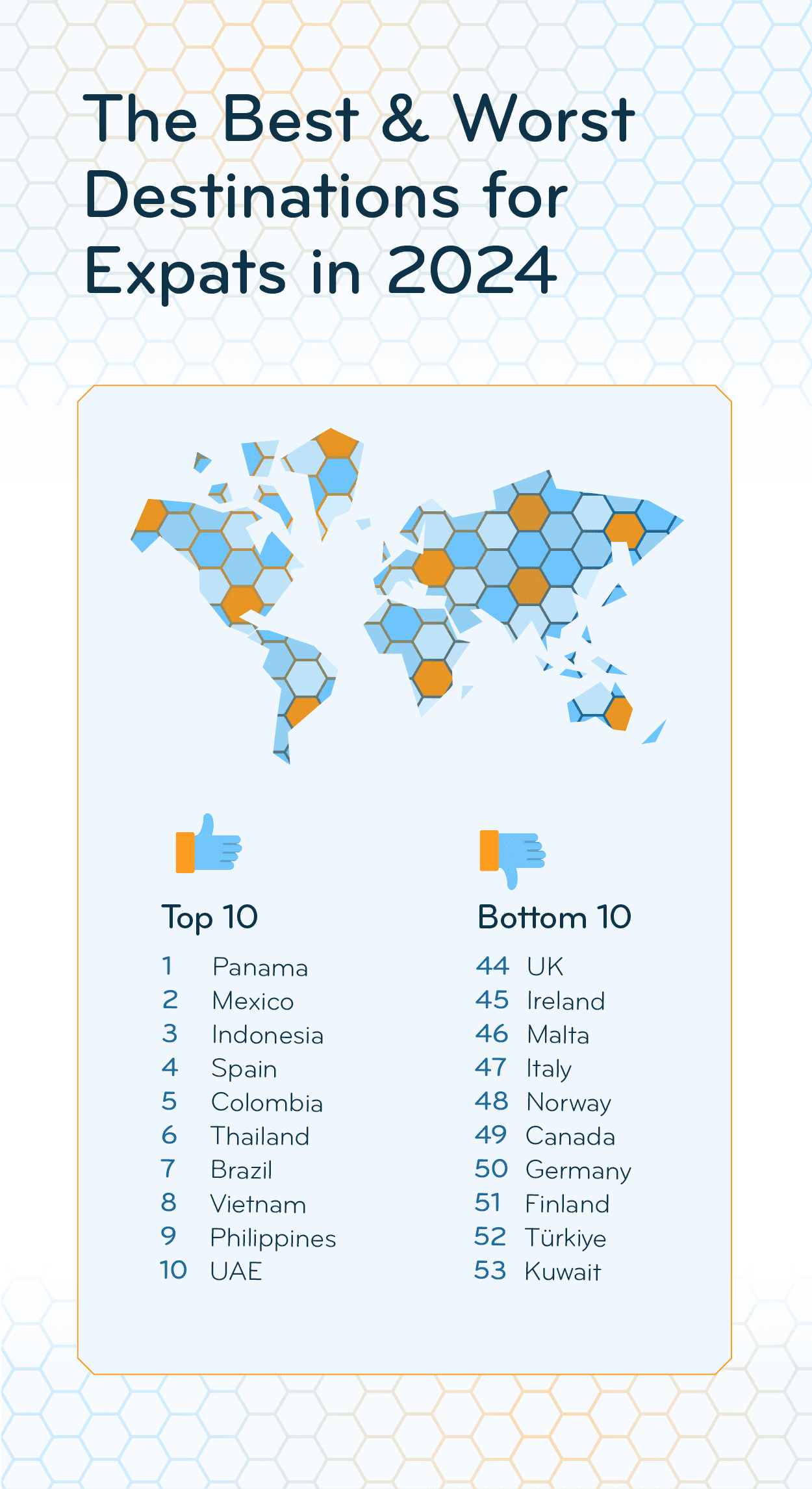 The four Southeast Asian countries in the top 10 — Indonesia (3rd), Thailand (6th), Vietnam (8th), and the Philippines (9th) — paint a very similar picture. Expats love them for the Ease of Settling In (from Vietnam’s 13th place to the Philippines’ 3rd) and their Personal Finances (from Thailand’s 8th place to Vietnam’s 1st).