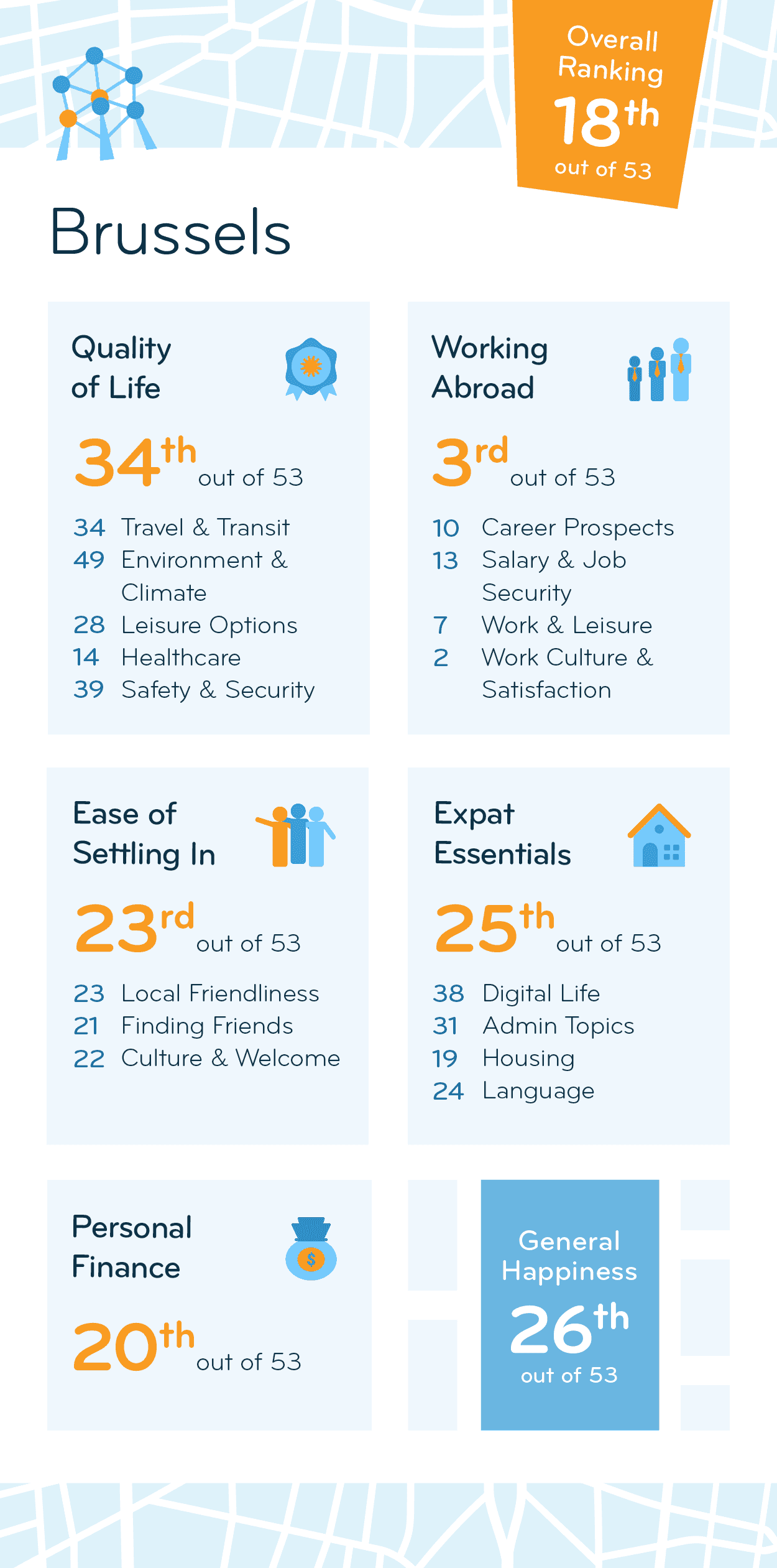 Brussels jumps 13 spots in the 2024 Expat City Ranking to land in 18th place (out of 53 cities). The city performs best in the Working Abroad Index (3rd) but doesn’t delight as much in terms of Quality of Life (34th) — the Environment & Climate Subcategory (49th) is especially poor. All things considered, expats’ happiness with their life in Brussels ranks 26th, an improvement from 33rd in 2023.