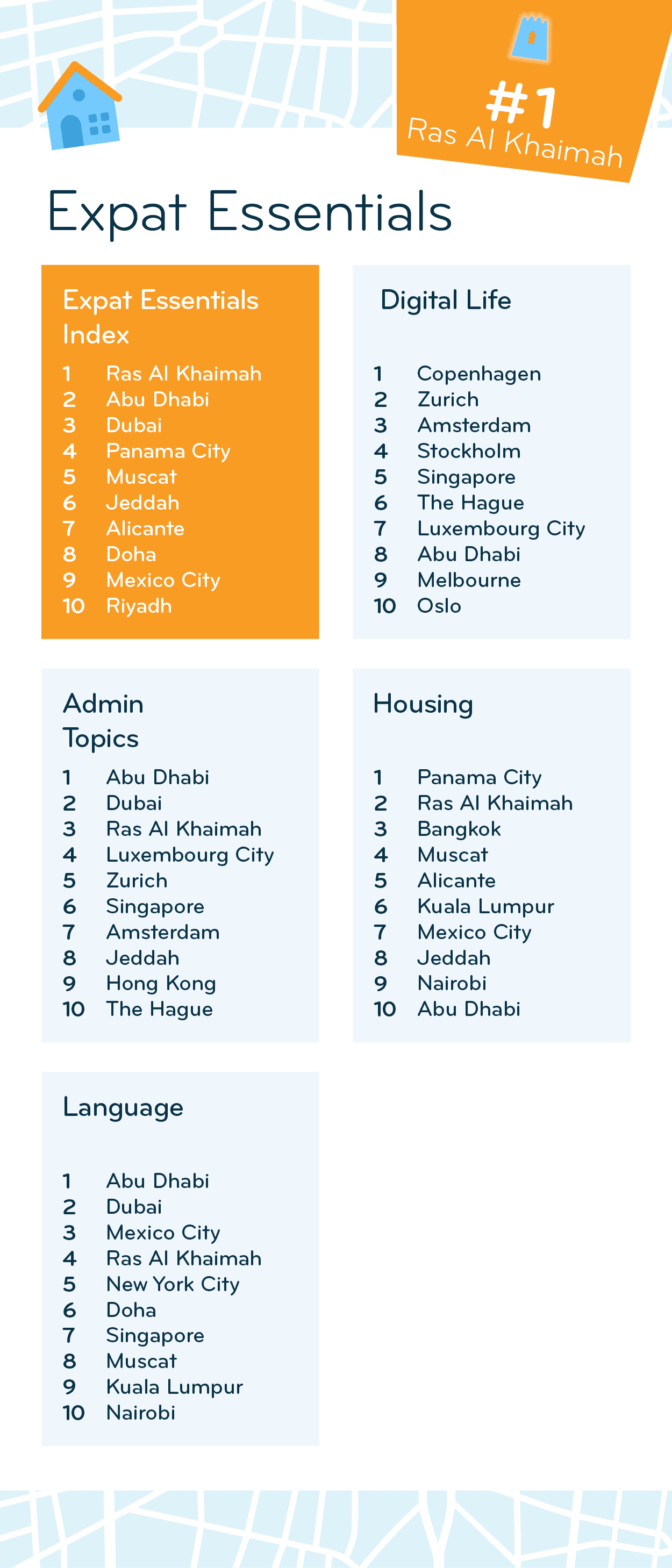 Admin Topics and Language delight expats in all three cities, as neither subcategory is found outside the top 5. Abu Dhabi even ranks 1st for both.