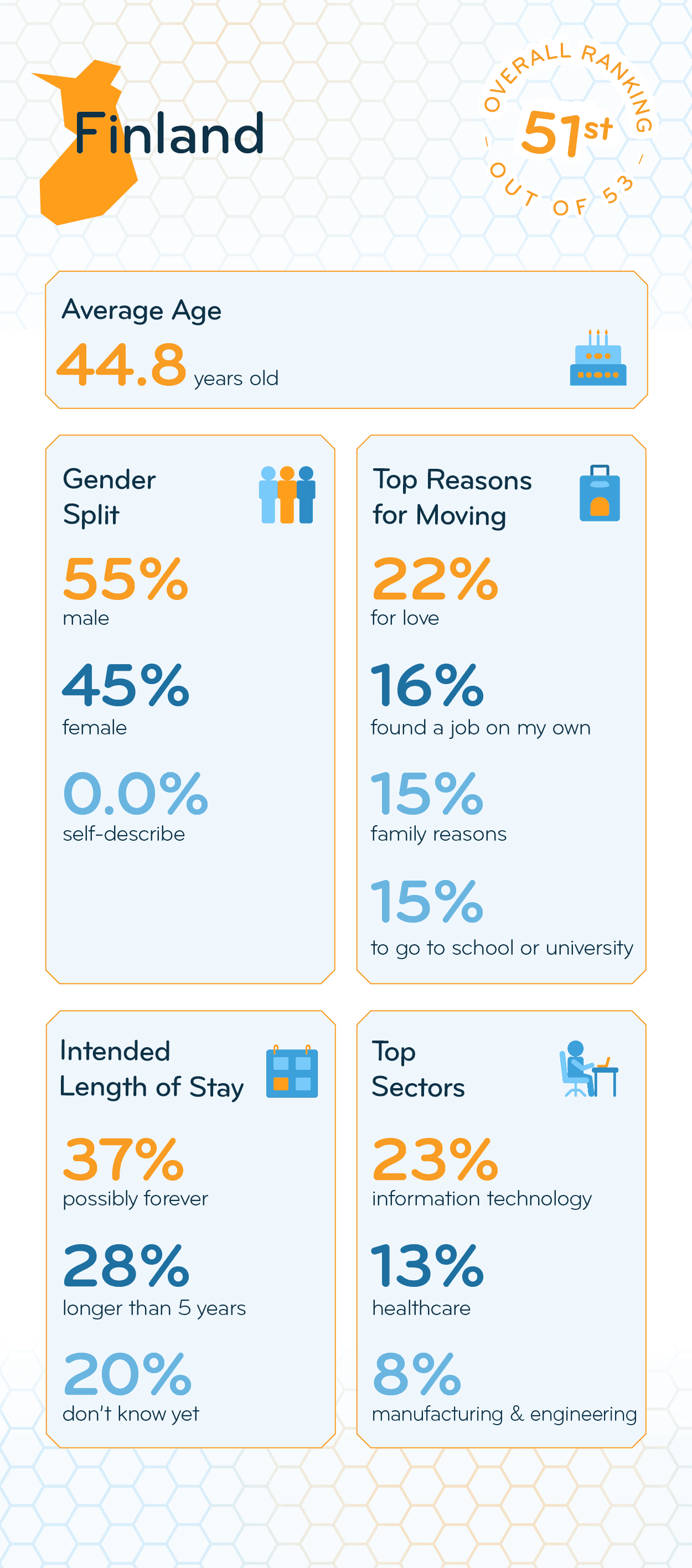 Finland’s challenges in expat integration are evident in its bottom-10 ranking for the Ease of Settling In Index (50th) and its three subcategories: Local Friendliness (48th), Culture & Welcome (51st), and Finding Friends (52nd).