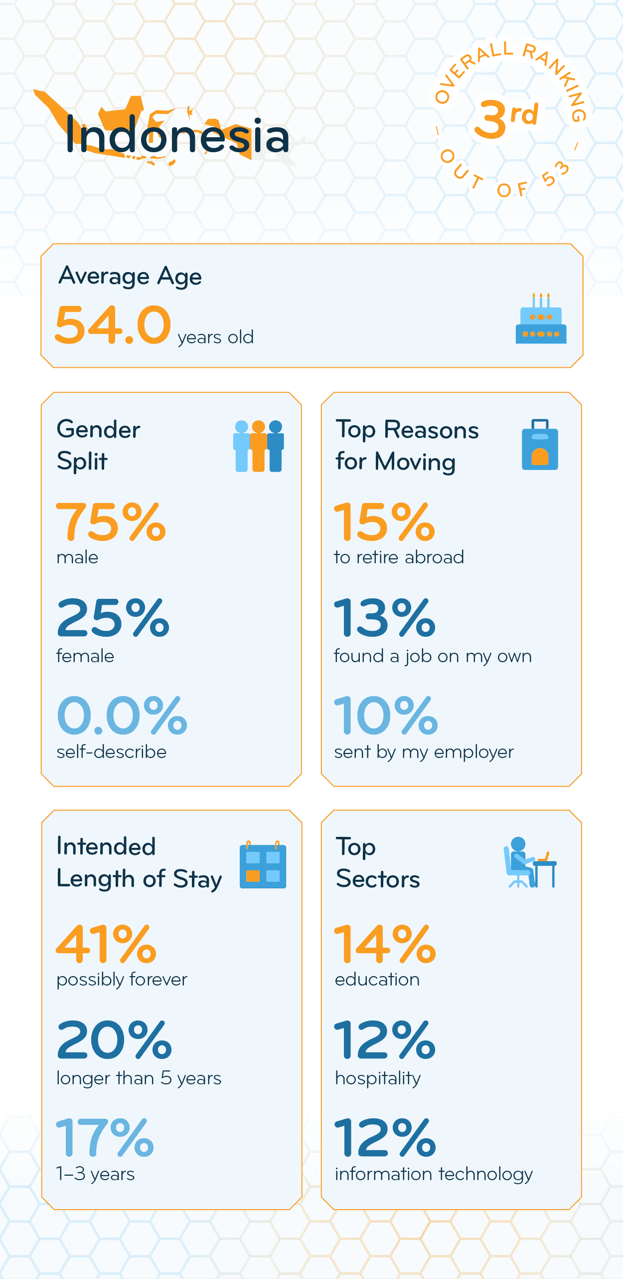 Indonesia also ranks 1st for expats’ overall job satisfaction and personal career opportunities; though only about half (52%) find that moving there improved their prospects (vs. 56% globally). Jobs don’t stand out as a main reason for relocating to Indonesia, either (34% vs. 35% globally). Instead, five times the global average made the journey to retire there (15% vs. 3% globally). Still, among those working, two-thirds (67%) agree that they’re paid fairly for their work (vs. 58% globally).