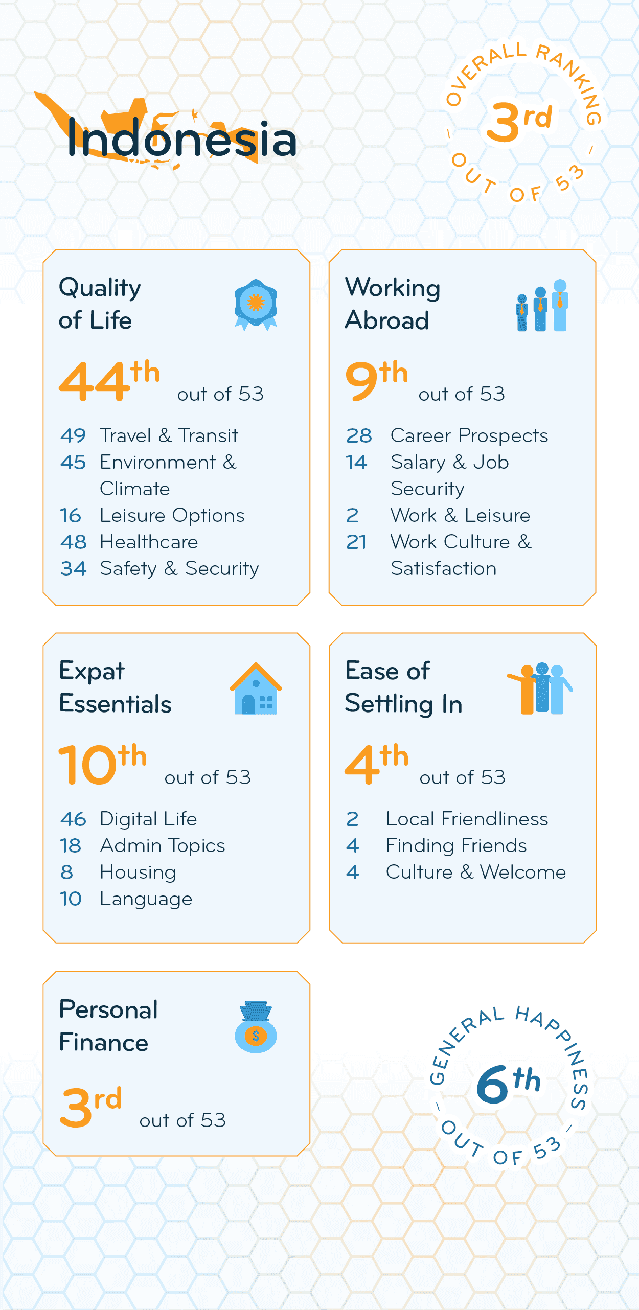 Indonesia receives some of its worst results in the Quality of Life Index (44th), where it’s in the bottom 10. An amazing climate & weather (11th), culinary variety (11th), and an enjoyable culture & nightlife (14th) cannot make up for the fact that expats face some major challenges.