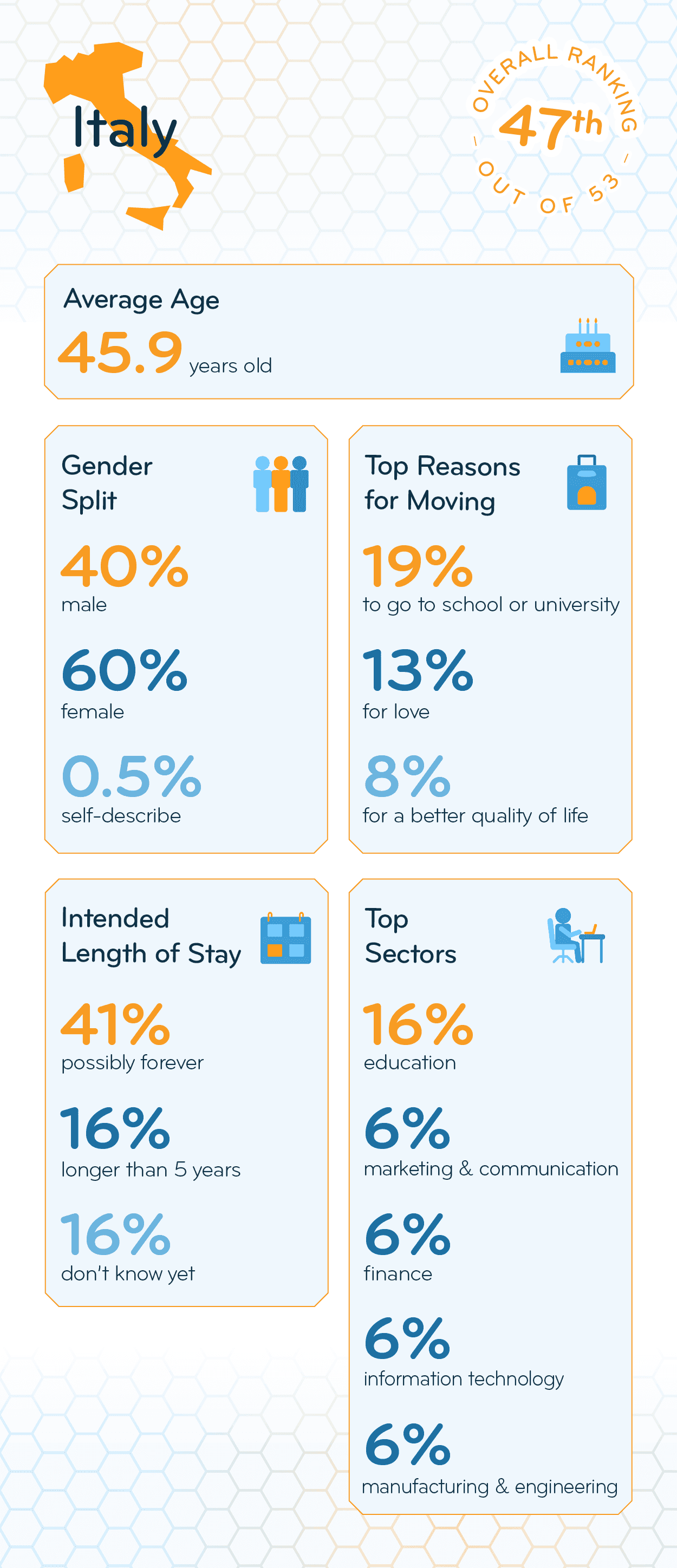 Larger shares than the global average are unhappy with their social life (32% vs. 29% globally) and face difficulties in making local friends (45% vs. 41%). It’s hardly surprising that Italy trends lower than the global average when it comes to feeling at home (52% vs. 58% globally) and welcome (58% vs. 63%) there.