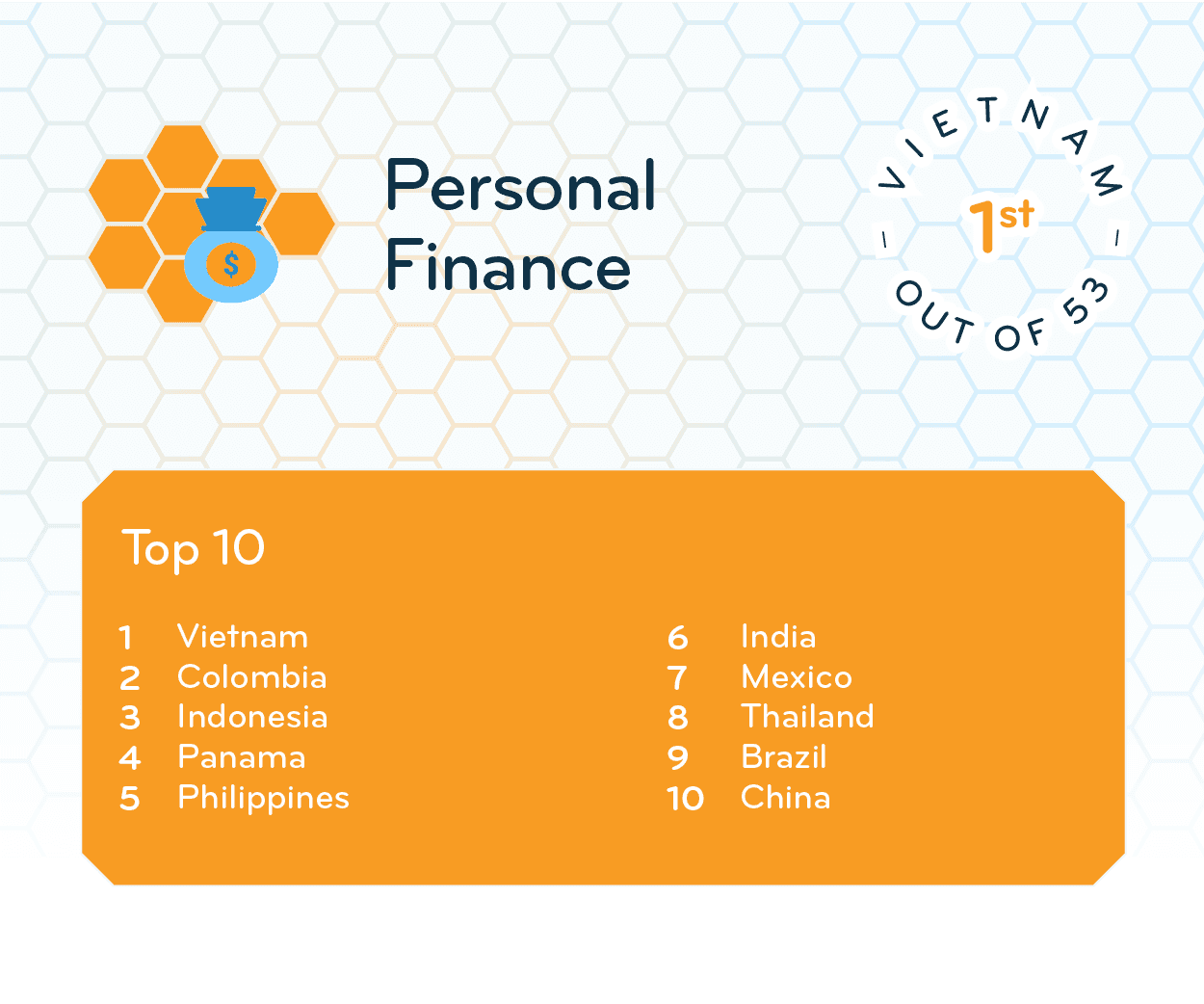 Six countries in the top 10 can be found in Asia: Vietnam (1st), Indonesia (3rd), the Philippines (5th), India (6th), Thailand (8th), and China (10th). They all perform very well across the three factors of the index.
